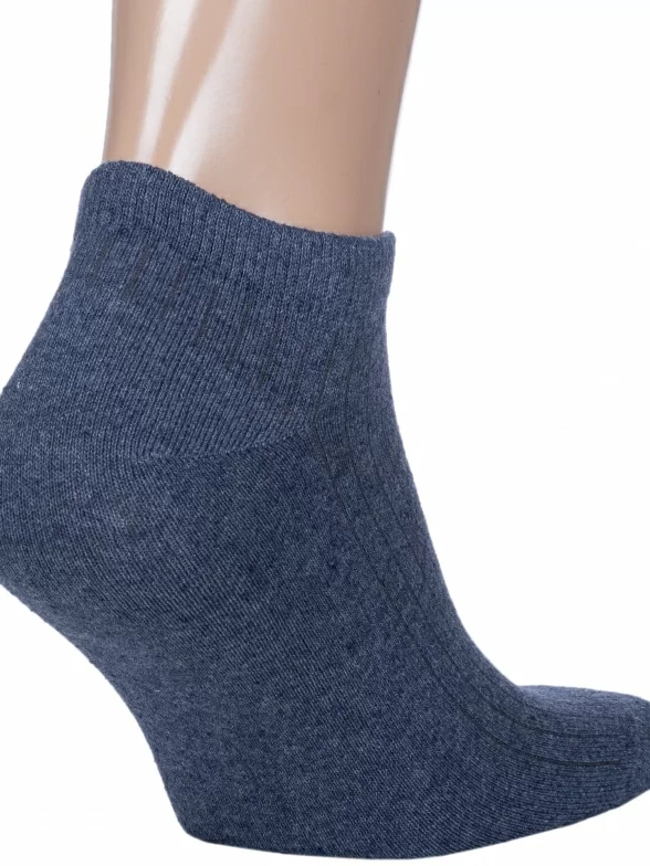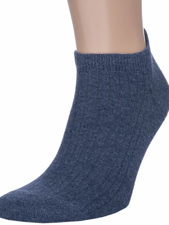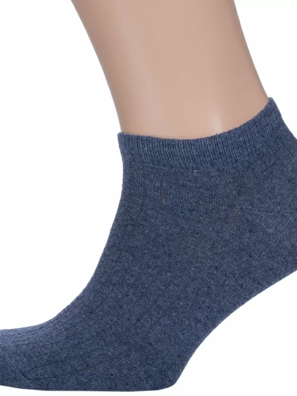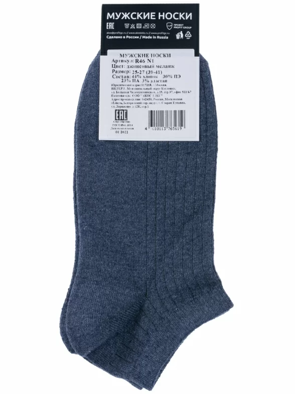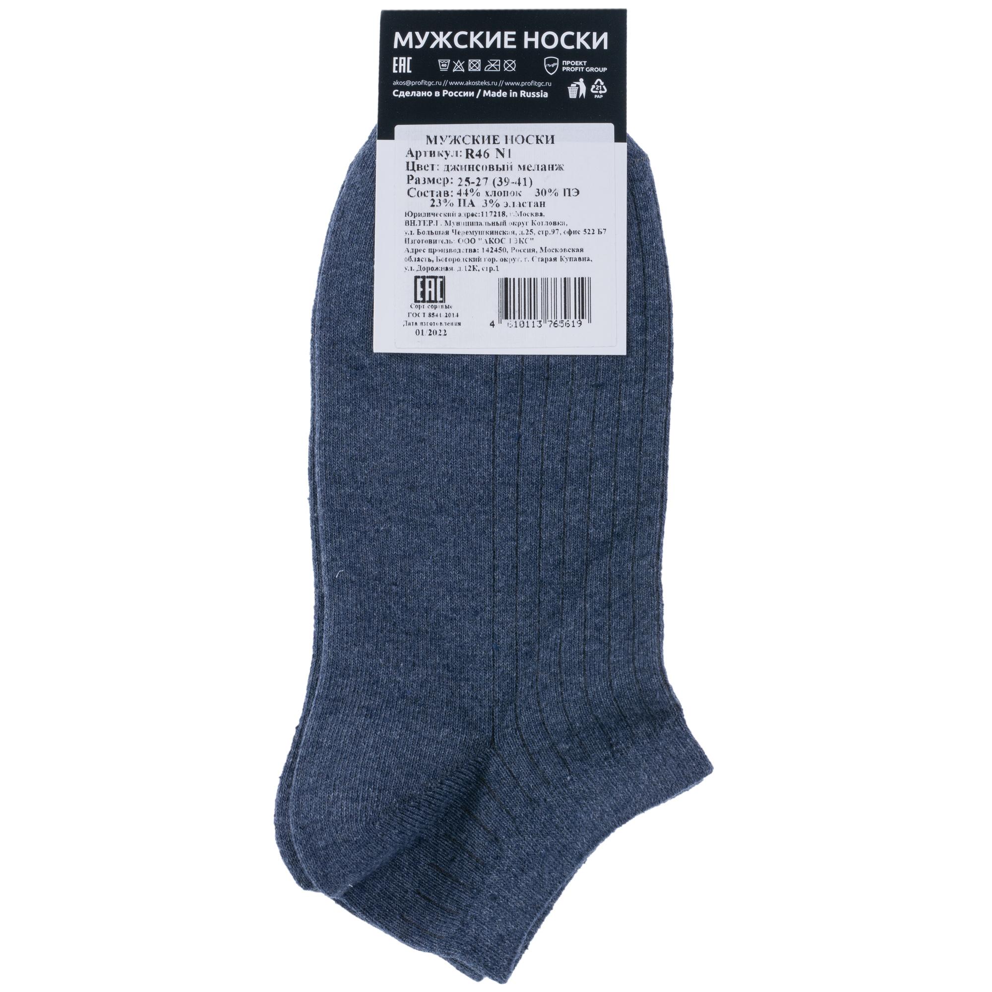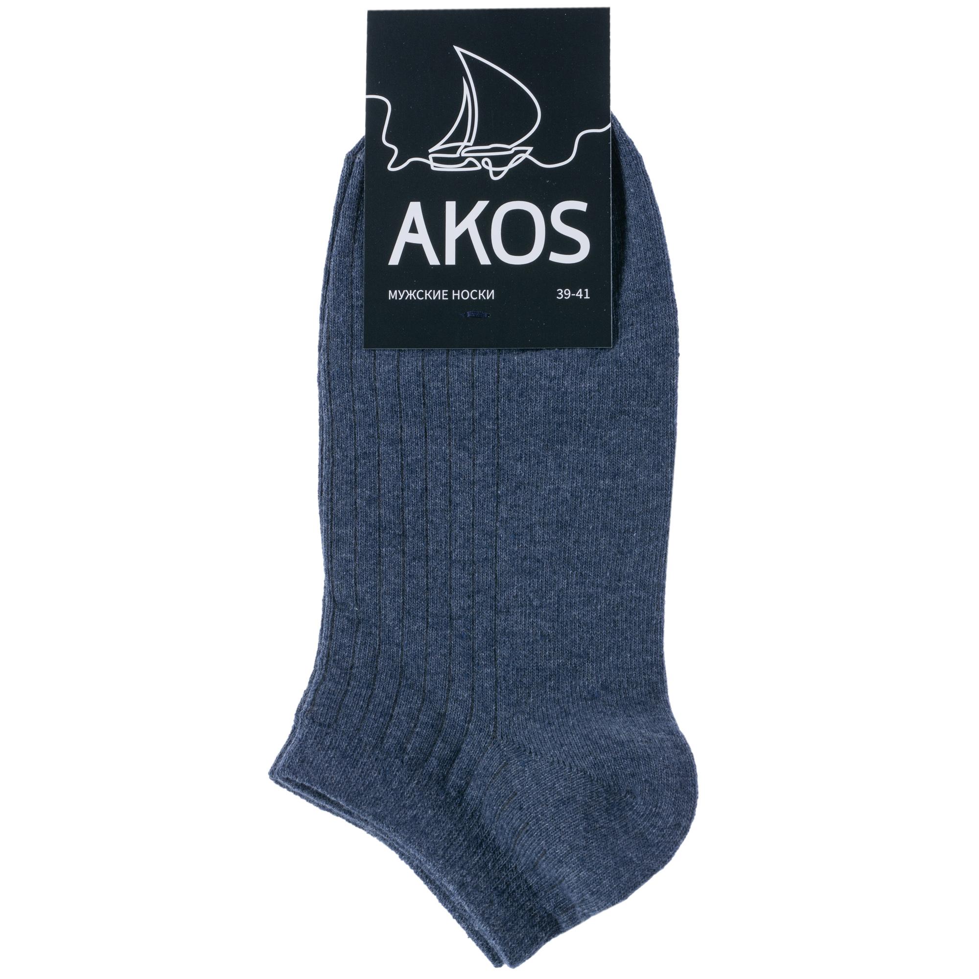 Круглогодичные или летние короткие мужские носки, цвет синий-джинс, спортивные, классические, шов обычный (не бесшовные), принт (рисунок): в рубчик, однотонный, состав: 44% хлопок, 30% полиэстер, 23% полиамид, 3% эластан, арт. R46N1. Производитель «ООО «АКОС ТЭКС», Московская область, Россия» под брендом «Akos».