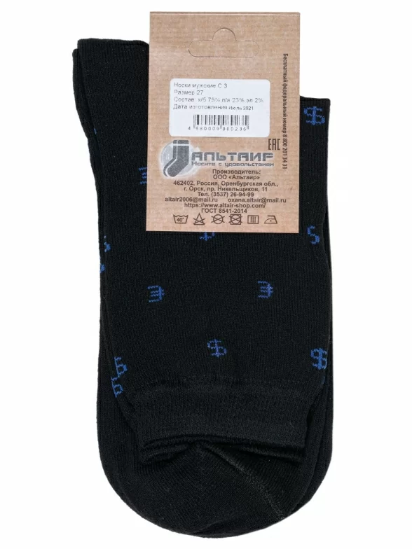 Круглогодичные средней длины мужские носки, цвет черный, повседневные, шов обычный (не бесшовные), принт (рисунок): надписи, мелкий принт, с узором, состав: 75% хлопок, 23% полиамид, 2% эластан, арт. С3. Производитель «ООО Альтаир, г. Орск, Оренбургская обл, Россия» под брендом «Альтаир».
