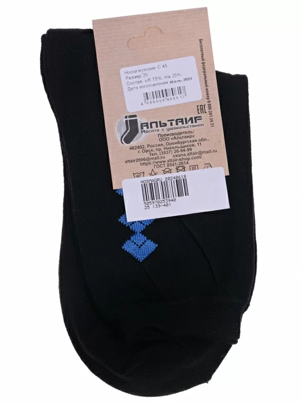 Межсезонные или летние укороченные мужские носки, цвет черный, классические, шов обычный (не бесшовные), принт (рисунок): аргайл, однотонный, небольшой рисунок, состав: 75% хлопок, 25% полиамид, арт. С45. Производитель «ООО Альтаир, г. Орск, Оренбургская обл, Россия» под брендом «Альтаир».
