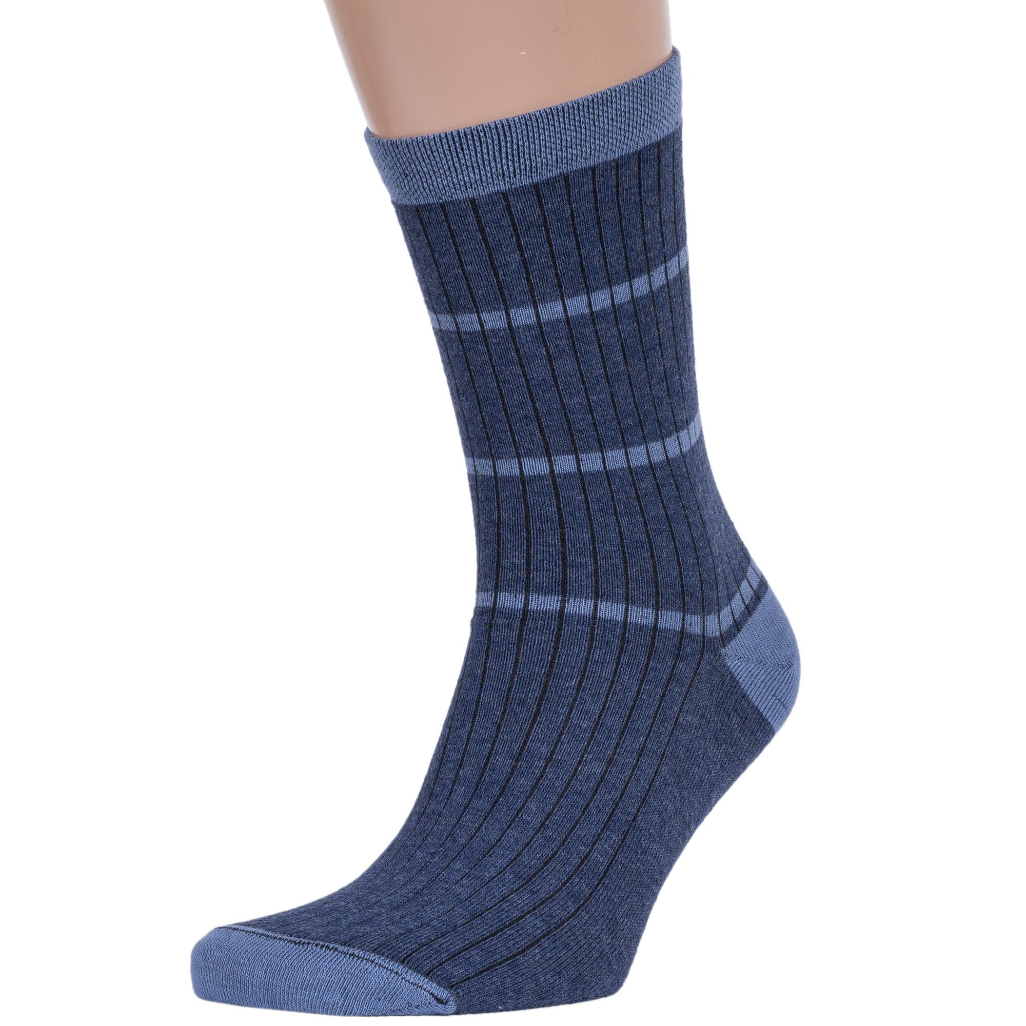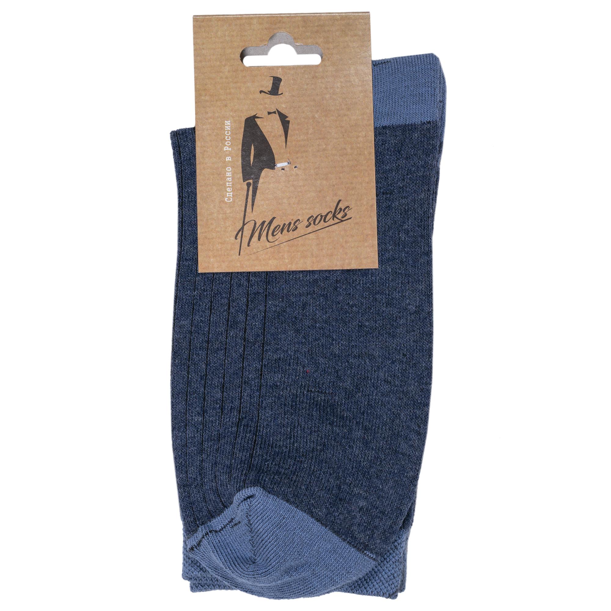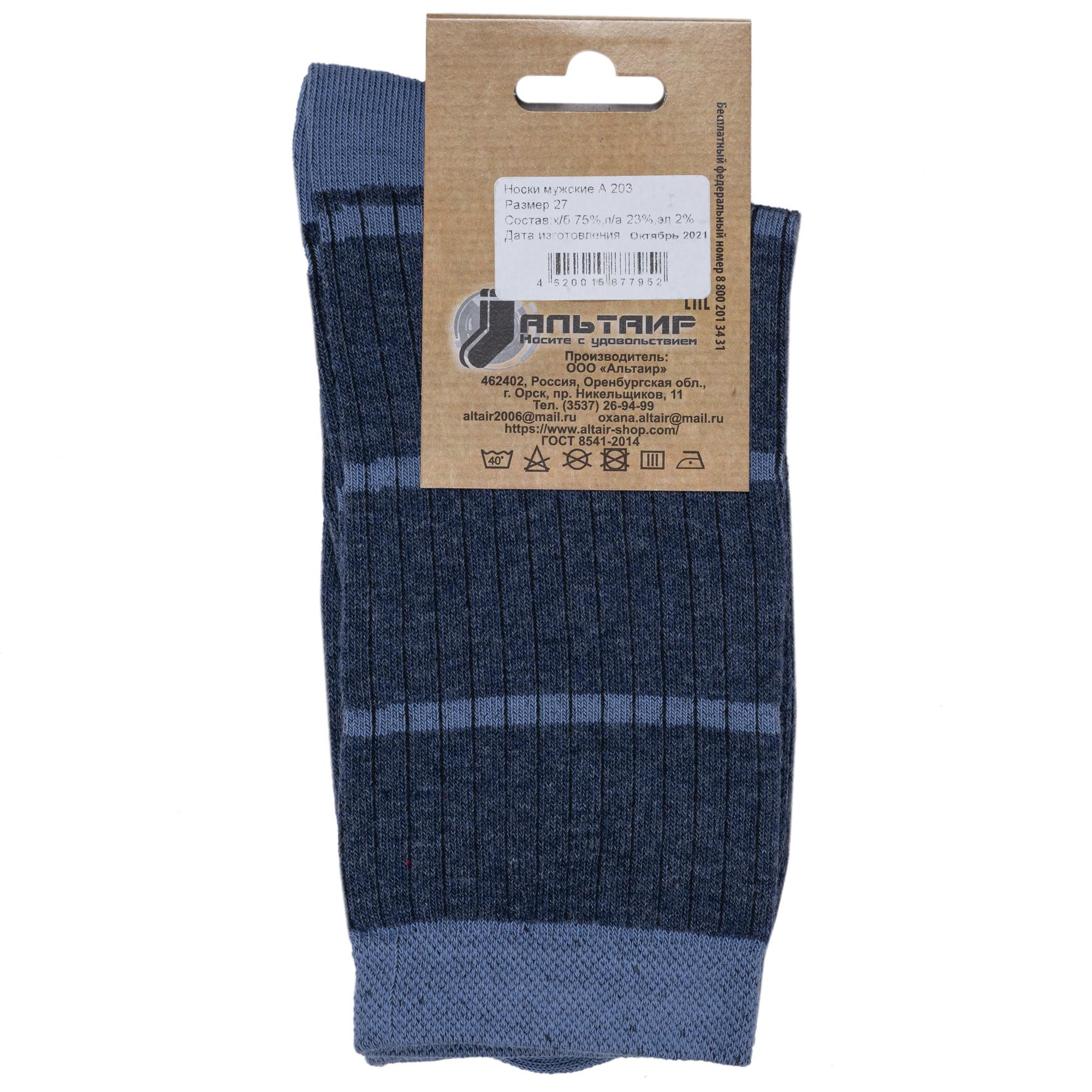 Круглогодичные средней длины мужские носки, цвет синий-джинс, классические, шов обычный (не бесшовные), принт (рисунок): полоски, в рубчик, с узором, состав: 78% хлопок, 20% полиамид, 2% эластан, арт. А203. Производитель «ООО Альтаир, г. Орск, Оренбургская обл, Россия» под брендом «Альтаир».