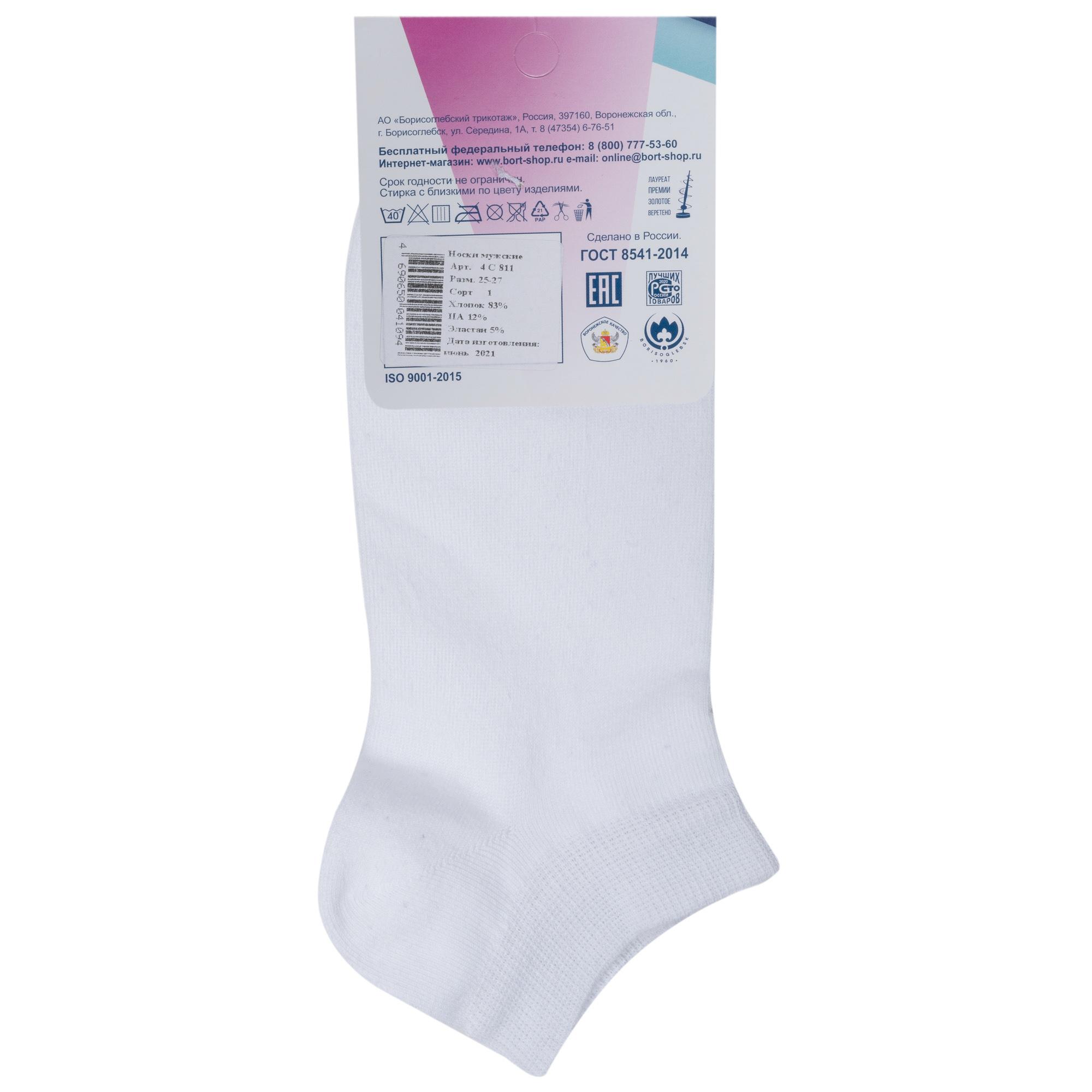 Круглогодичные или летние короткие мужские носки, цвет белый, классические, шов обычный (не бесшовные), принт (рисунок): однотонный, без рисунков/узоров, состав: 83% хлопок, 12% полиамид, 5% эластан, арт. 4С811. Производитель «АО Борисоглебский трикотаж, Воронежская обл, Россия» под брендом «Борисоглебский трикотаж».