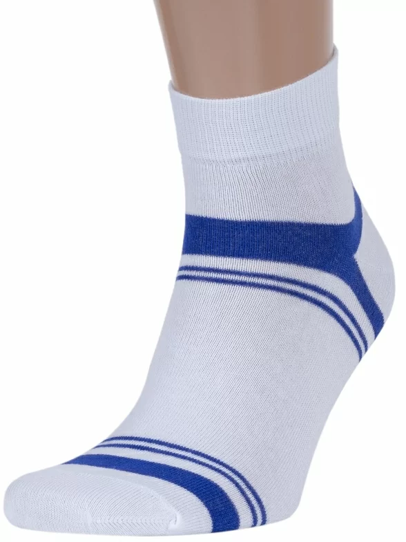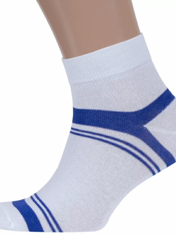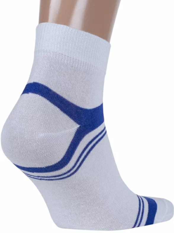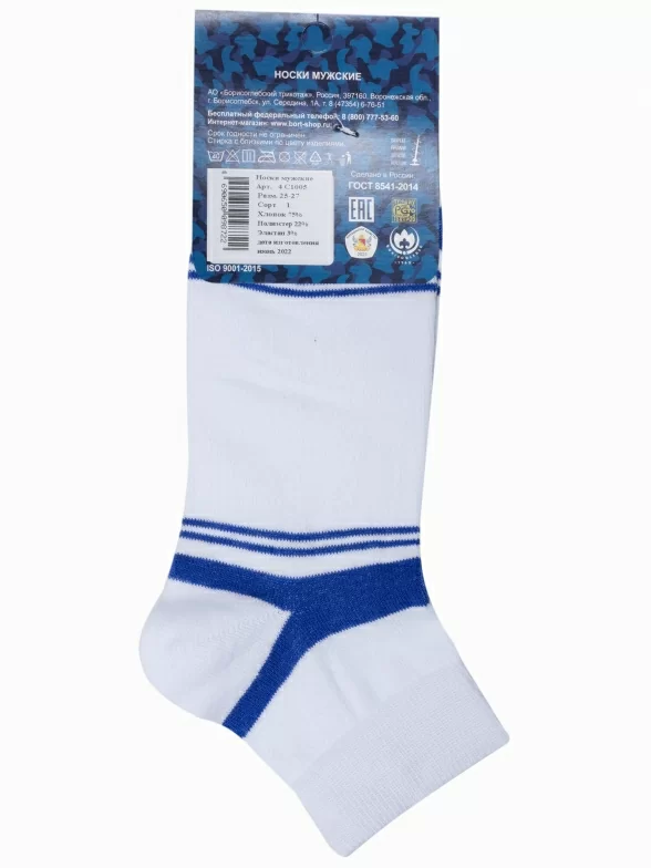 Круглогодичные укороченные мужские носки, цвет белый, спортивные, шов обычный (не бесшовные), принт (рисунок): спортивные, с узором, состав: 75% хлопок, 22% полиэстер, 3% эластан, арт. 4С1005. Производитель «АО Борисоглебский трикотаж, Воронежская обл, Россия» под брендом «Борисоглебский трикотаж».