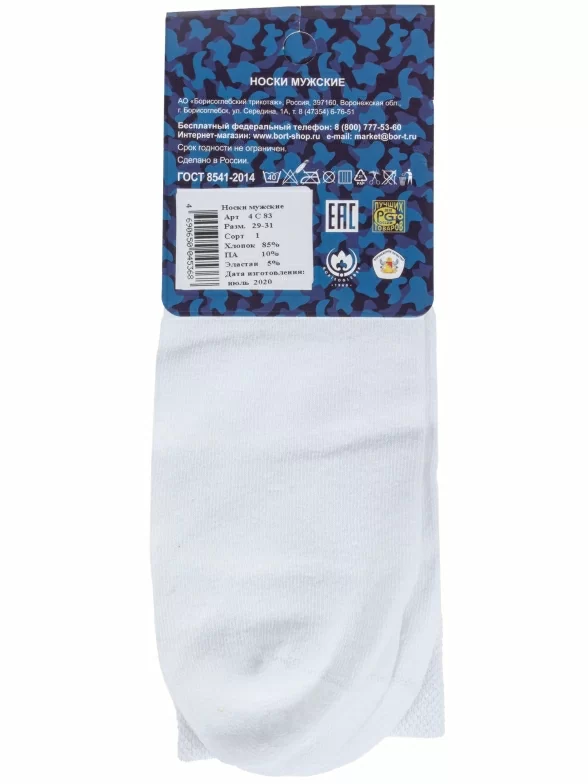 Круглогодичные средней длины мужские носки, цвет белый, классические, возможно бесшовные, принт (рисунок): однотонный, без рисунков/узоров, состав: 85% хлопок, 10% полиамид, 5% эластан, арт. 4С83. Производитель «АО Борисоглебский трикотаж, Воронежская обл, Россия» под брендом «Борисоглебский трикотаж».