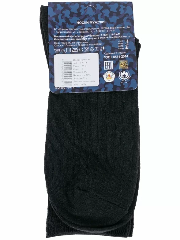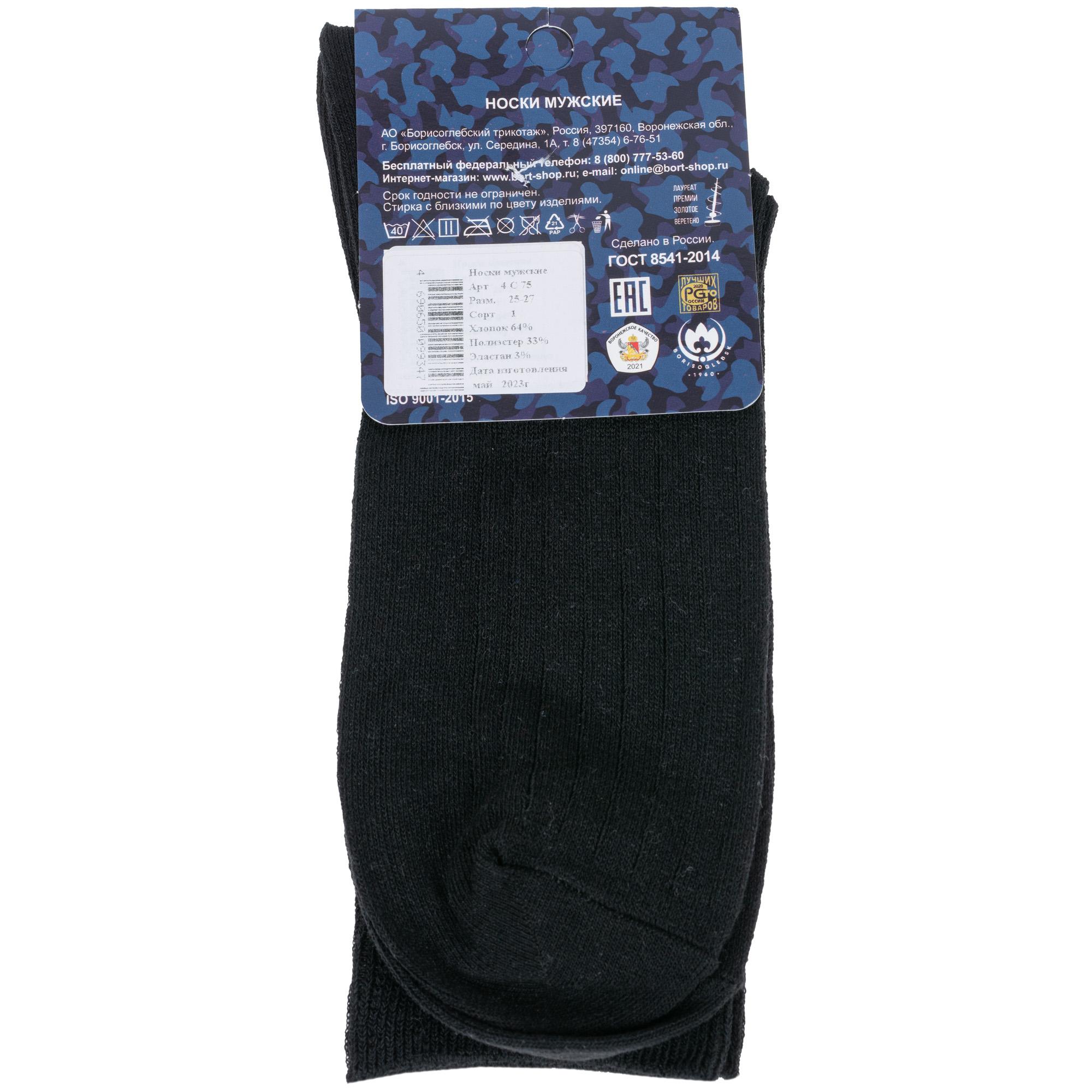 Круглогодичные средней длины мужские носки, цвет черный, классические, шов обычный (не бесшовные), принт (рисунок): в рубчик, с узором, однотонный, состав: 64% хлопок, 33% полиэстер, 3% эластан, арт. 4С75. Производитель «АО Борисоглебский трикотаж, Воронежская обл, Россия» под брендом «Борисоглебский трикотаж».