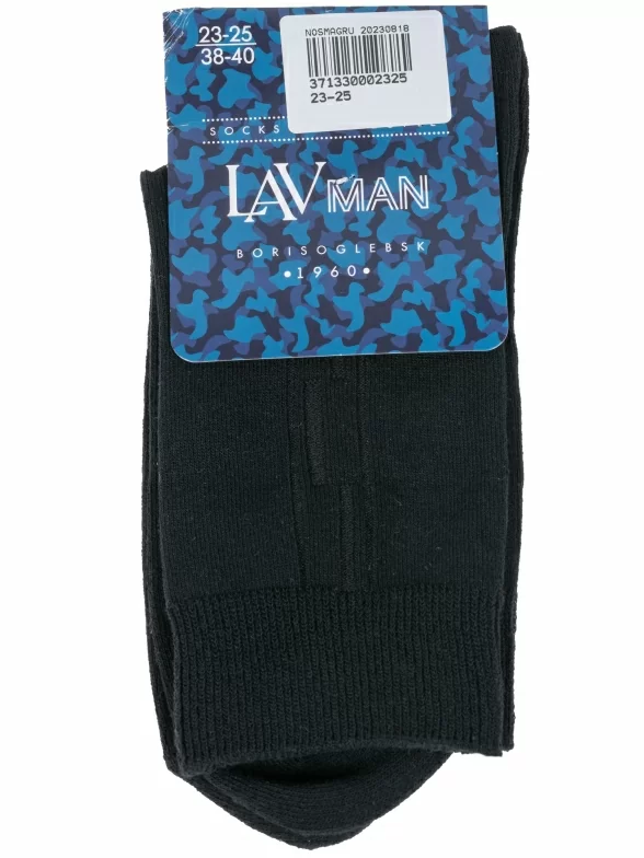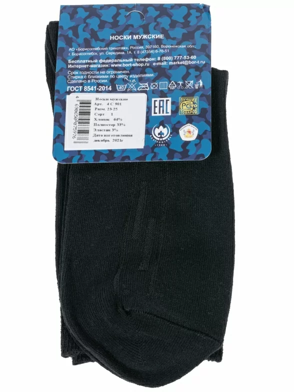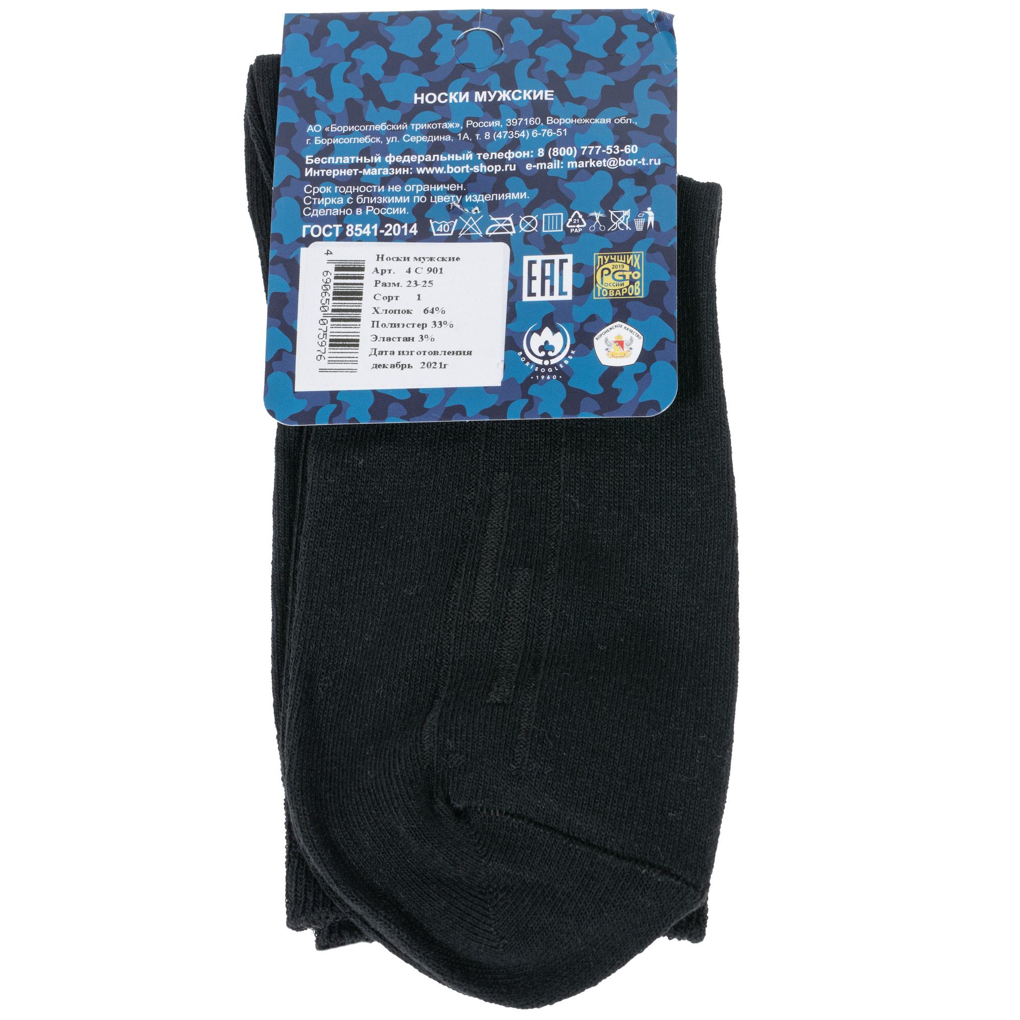 Круглогодичные средней длины мужские носки, цвет черный, классические, шов обычный (не бесшовные), принт (рисунок): полоски, с узором, однотонный, состав: 64% хлопок, 33% полиэстер, 3% эластан, арт. 4С901. Производитель «АО Борисоглебский трикотаж, Воронежская обл, Россия» под брендом «Борисоглебский трикотаж».