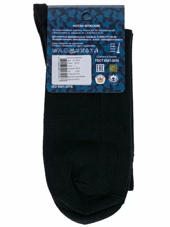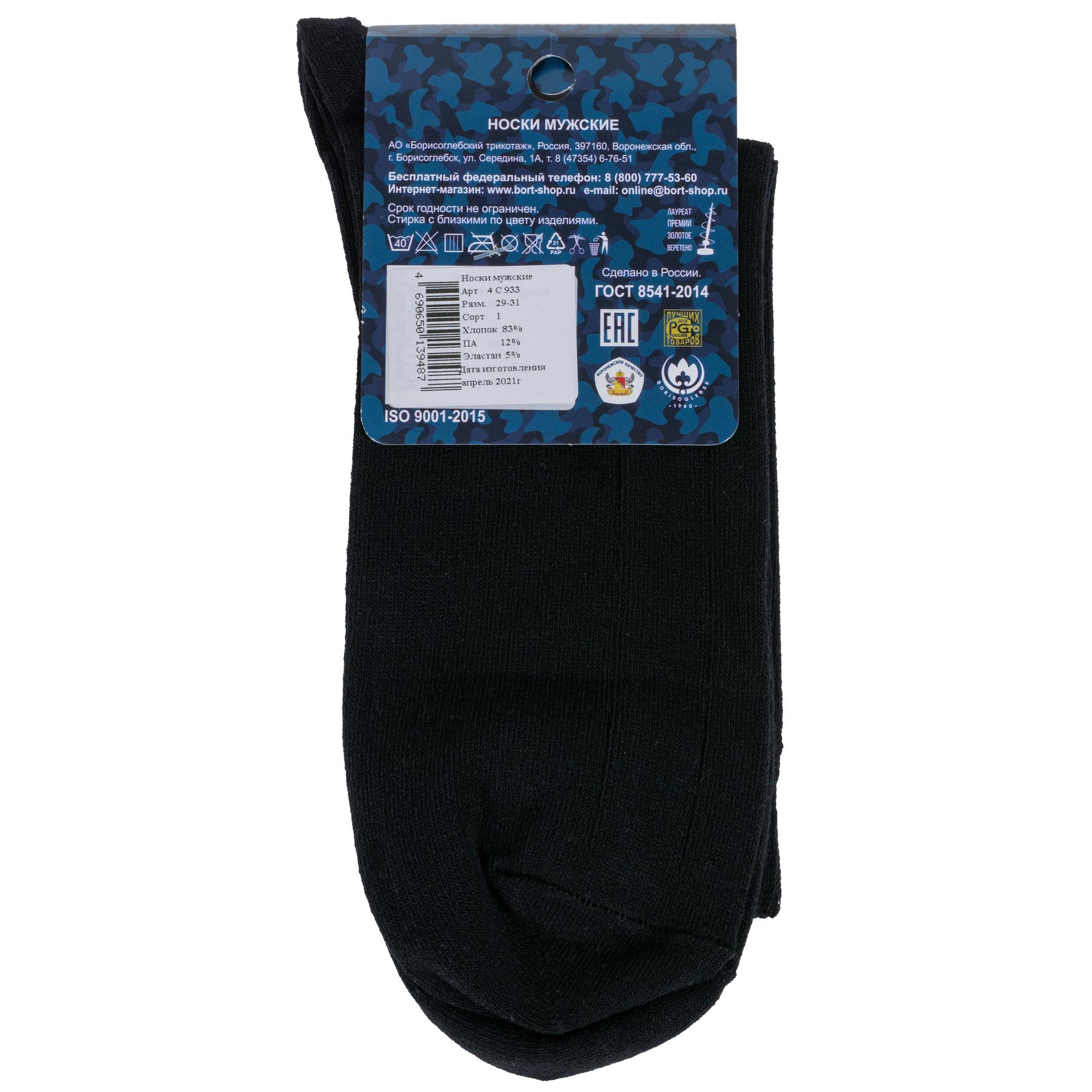 Круглогодичные укороченные мужские носки, цвет черный, классические, шов обычный (не бесшовные), принт (рисунок): в рубчик, однотонный, небольшой рисунок, состав: 83% хлопок, 12% полиамид, 5% эластан, арт. 4С933. Производитель «АО Борисоглебский трикотаж, Воронежская обл, Россия» под брендом «Борисоглебский трикотаж».
