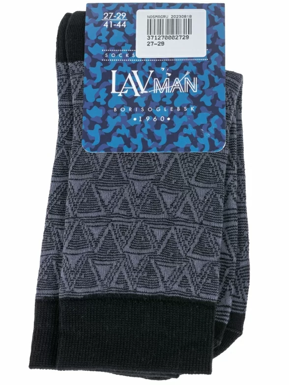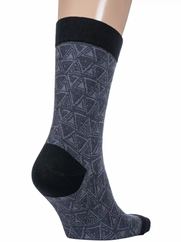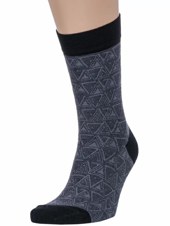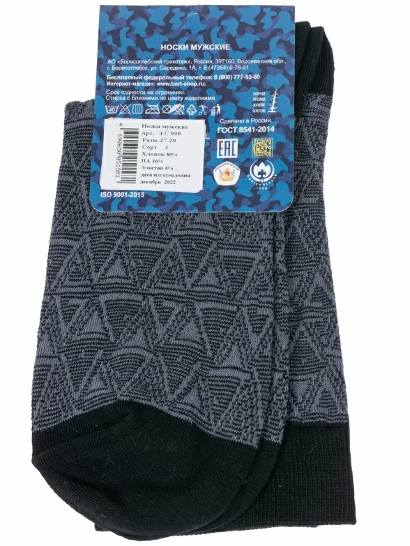 Круглогодичные средней длины мужские носки, цвет темно-серый, повседневные, шов обычный (не бесшовные), принт (рисунок): контрастные пятка / мысок / резинка, геометрия, с узором, состав: 80% хлопок, 16% полиамид, 4% эластан, арт. 4С999. Производитель «АО Борисоглебский трикотаж, Воронежская обл, Россия» под брендом «Борисоглебский трикотаж».
