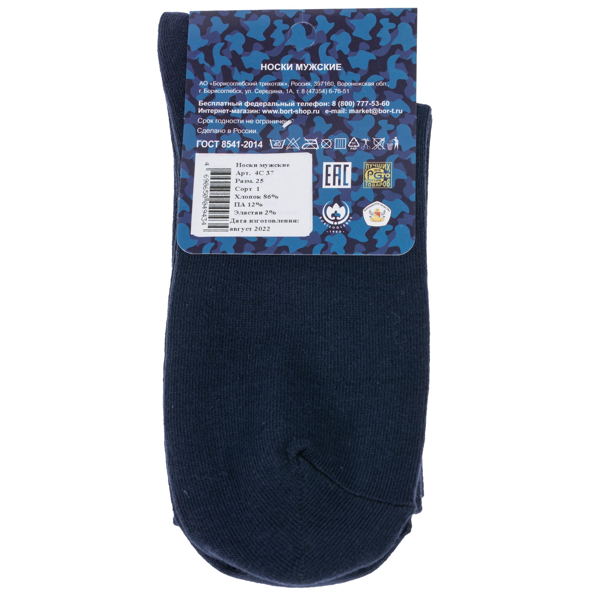 Круглогодичные средней длины мужские носки, цвет темно-синий, классические, шов обычный (не бесшовные), принт (рисунок): однотонный, без рисунков/узоров, состав: 86% хлопок, 12% полиамид, 2% эластан, арт. 4С37. Производитель «АО Борисоглебский трикотаж, Воронежская обл, Россия» под брендом «Борисоглебский трикотаж».