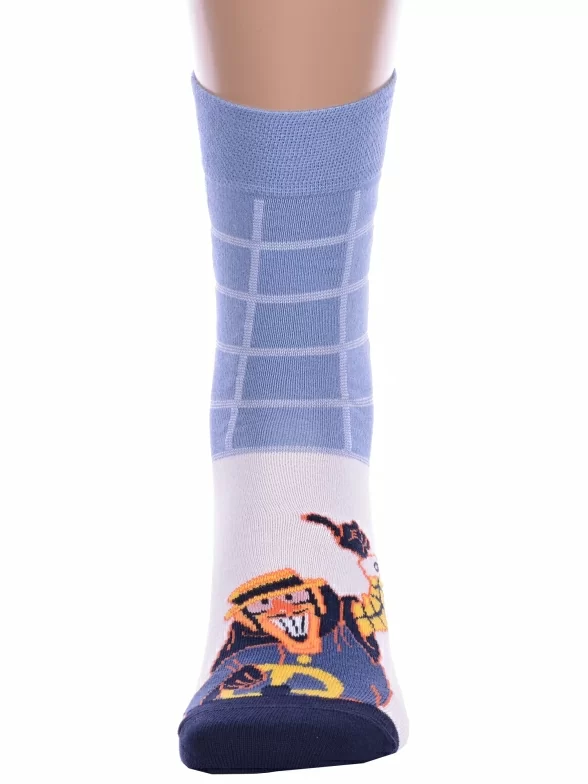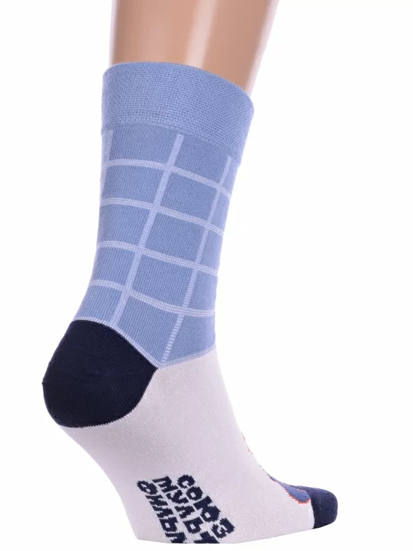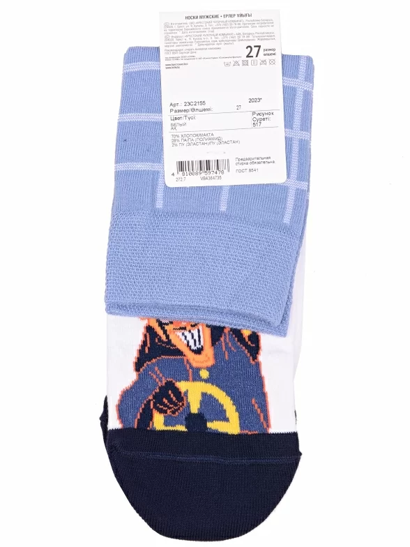 Круглогодичные укороченные мужские носки, цвет голубой-белый, повседневные, возможно бесшовные, принт (рисунок): фильмы / сериалы / мультики, люди, контрастные пятка / мысок / резинка, клетка, с узором, состав: 70% хлопок, 28% полиамид, 2% эластан, арт. 23С2155. Производитель «Брестский чулочный комбинат ОАО, Беларусь» под брендом «Брестские (бчк)».