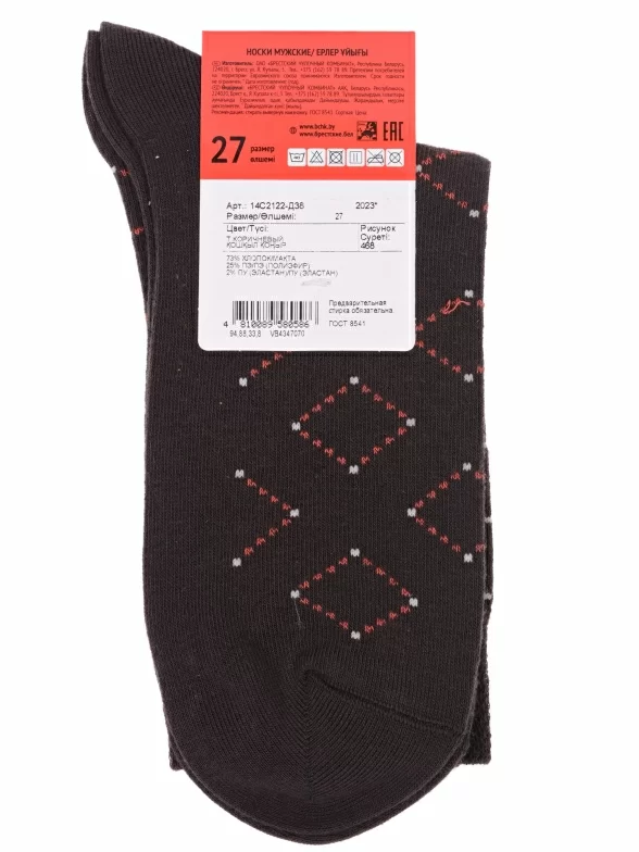 Мужские носки Брестские (БЧК) артикул 14с2122 в цвете рис. 468, темно-коричневые — это повседневная модель, предназначенная для круглогодичного использования. Размерный ряд охватывает обувь 42 и 43, длина стопы составляет 27 см. Насыщенный темно-коричневый цвет с рисунком 468 делает носки универсальным аксессуаром для различных стилей.