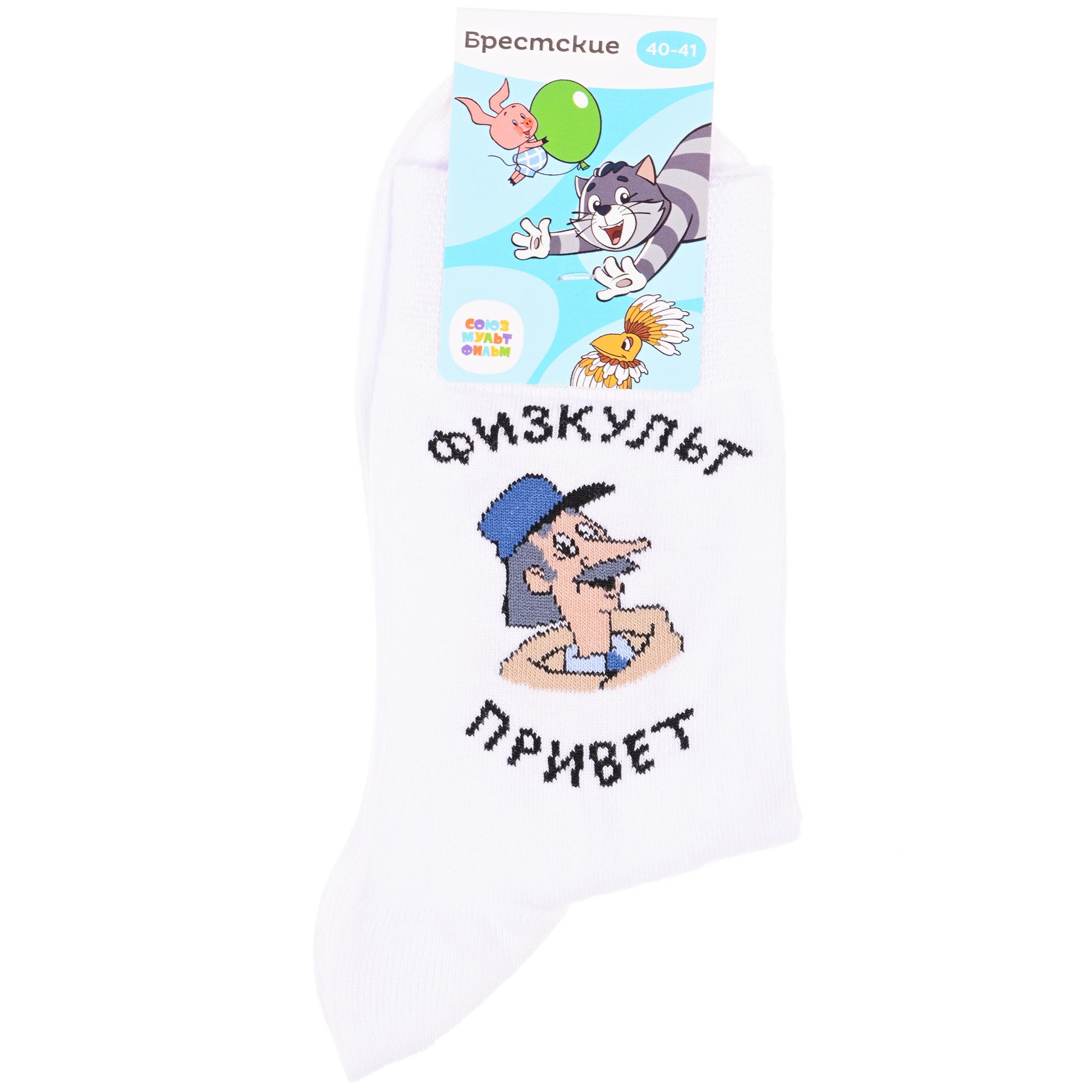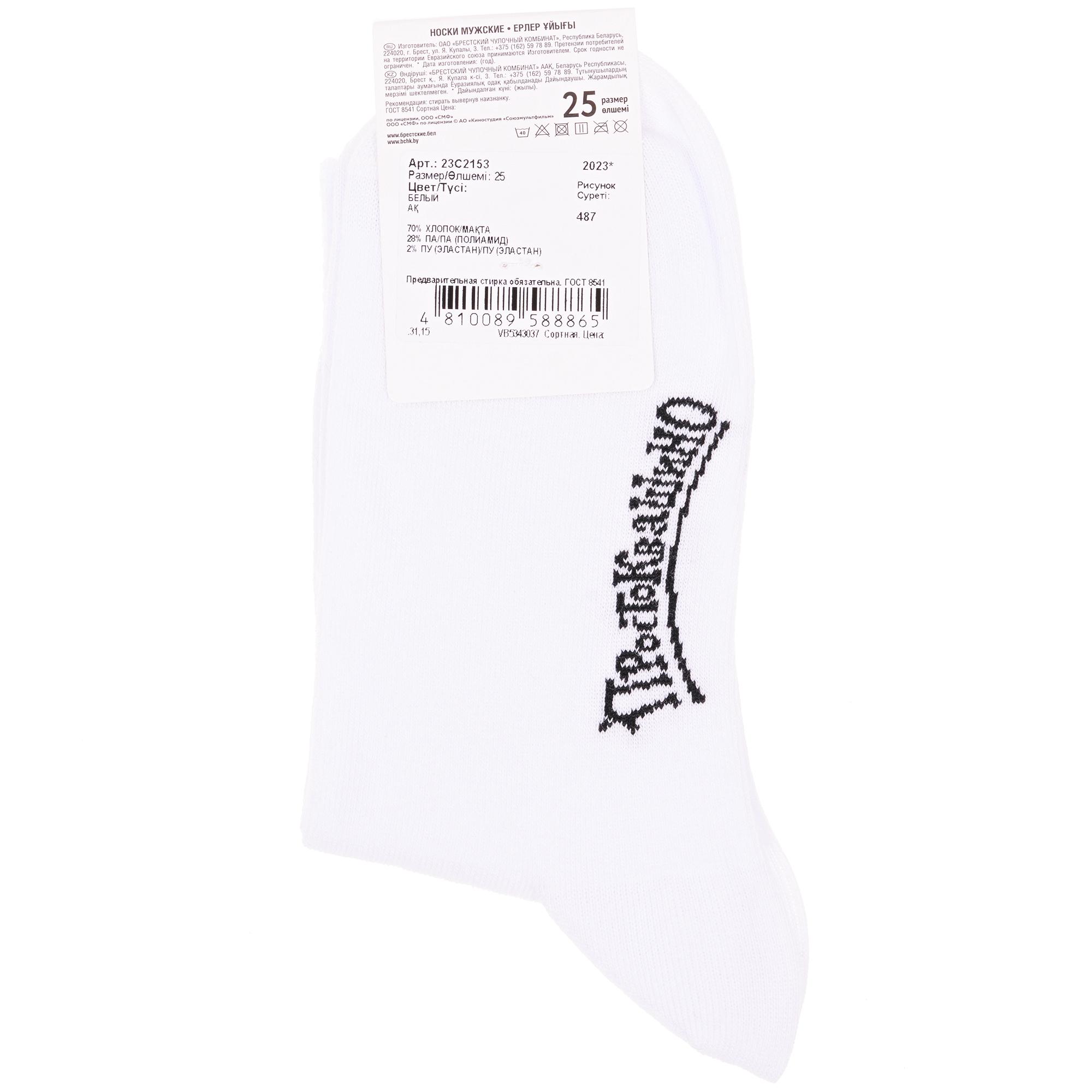 Круглогодичные укороченные мужские носки, цвет белый, повседневные, шов кеттельный (бесшовная технология), принт (рисунок): фильмы / сериалы / мультики, надписи, люди, с узором, состав: 70% хлопок, 28% полиамид, 2% эластан, арт. 23С2153. Производитель «Брестский чулочный комбинат ОАО, Беларусь» под брендом «Брестские (бчк)».