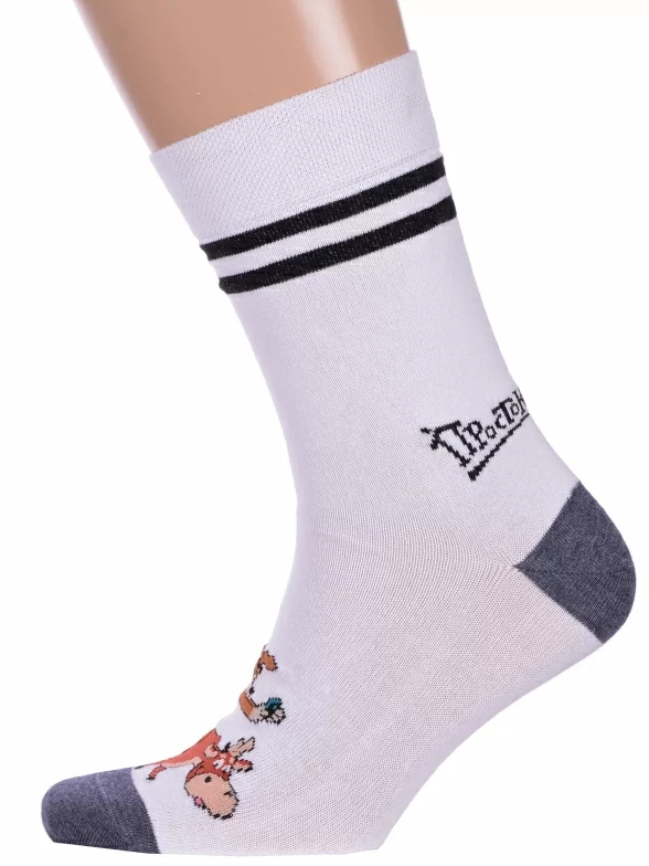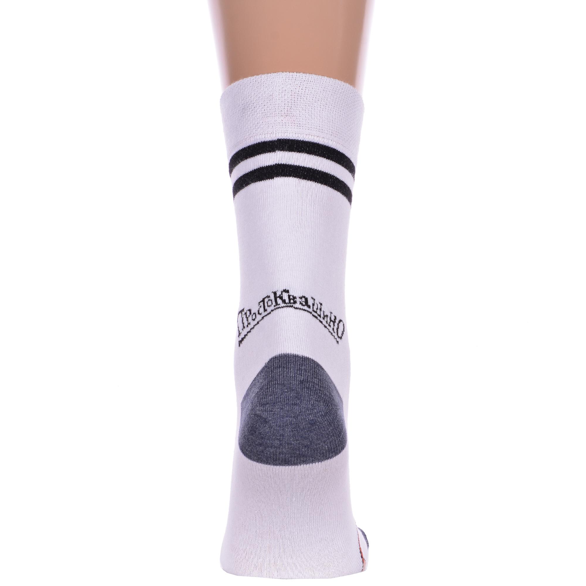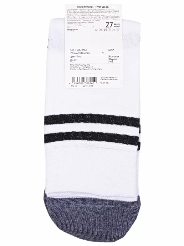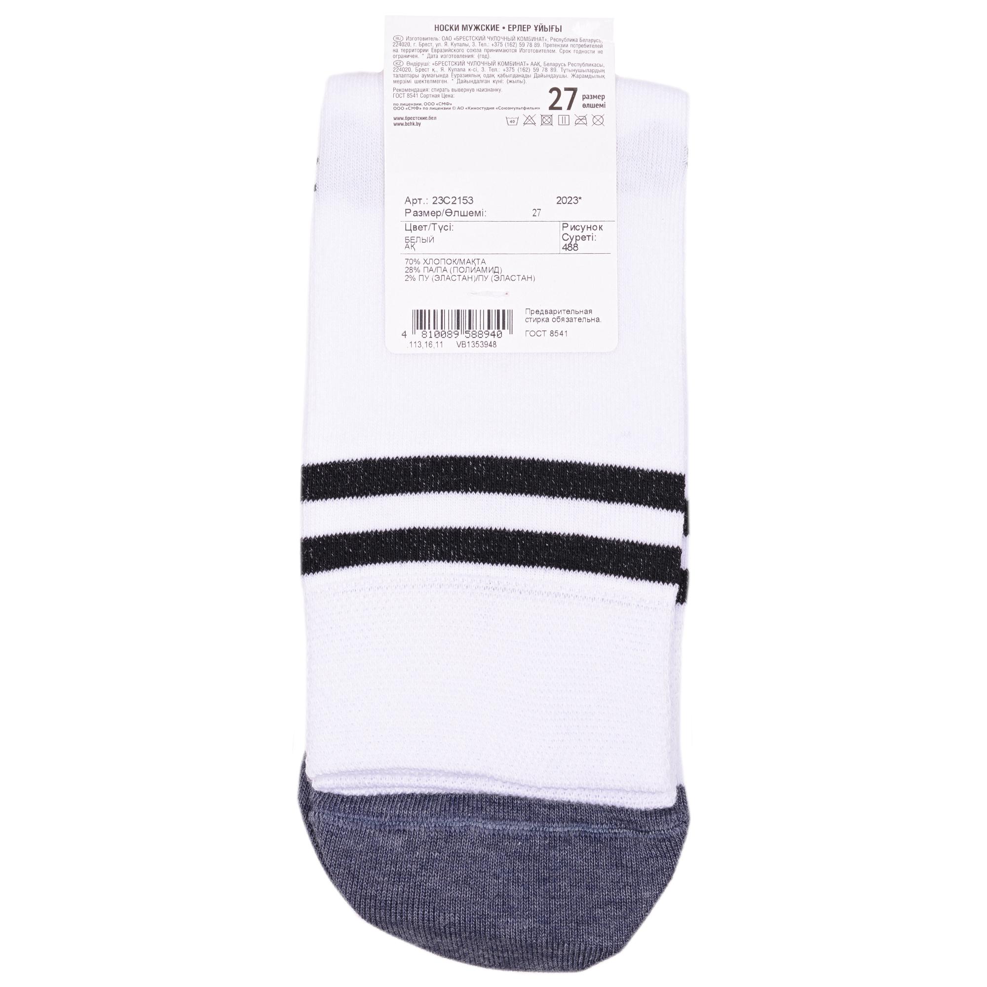 Круглогодичные укороченные мужские носки, цвет белый, повседневные, шов кеттельный (бесшовная технология), принт (рисунок): фильмы / сериалы / мультики, полоски, надписи, контрастные пятка / мысок / резинка, животные, с узором, состав: 70% хлопок, 28% полиамид, 2% эластан, арт. 23С2153. Производитель «Брестский чулочный комбинат ОАО, Беларусь» под брендом «Брестские (бчк)».