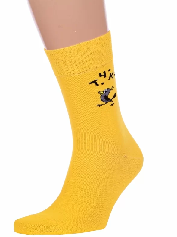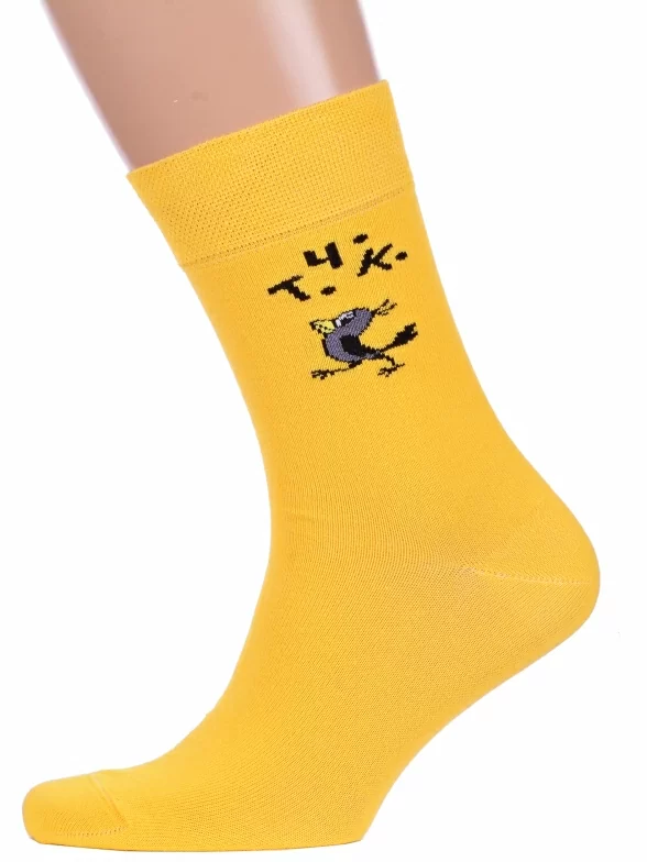 Круглогодичные средней длины мужские носки, цвет желтый, повседневные, шов кеттельный (бесшовная технология), принт (рисунок): фильмы / сериалы / мультики, надписи, животные, с узором, состав: 70% хлопок, 28% полиамид, 2% эластан, арт. 23С2153. Производитель «Брестский чулочный комбинат ОАО, Беларусь» под брендом «Брестские (бчк)».