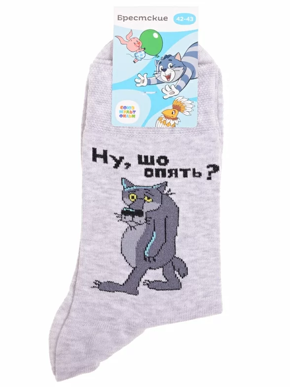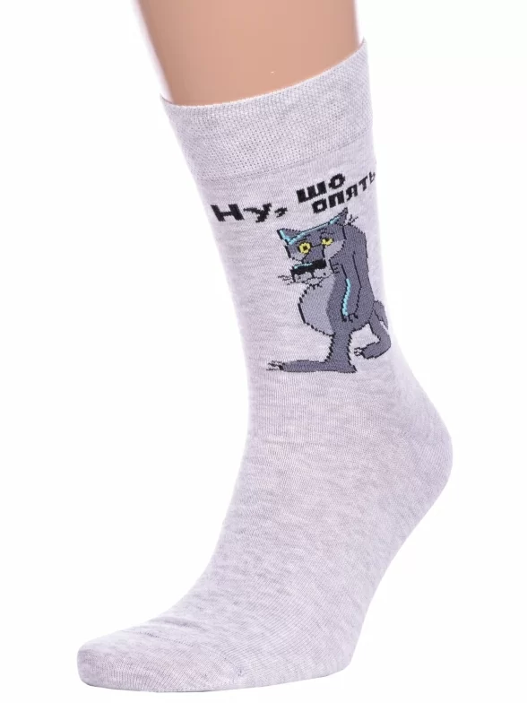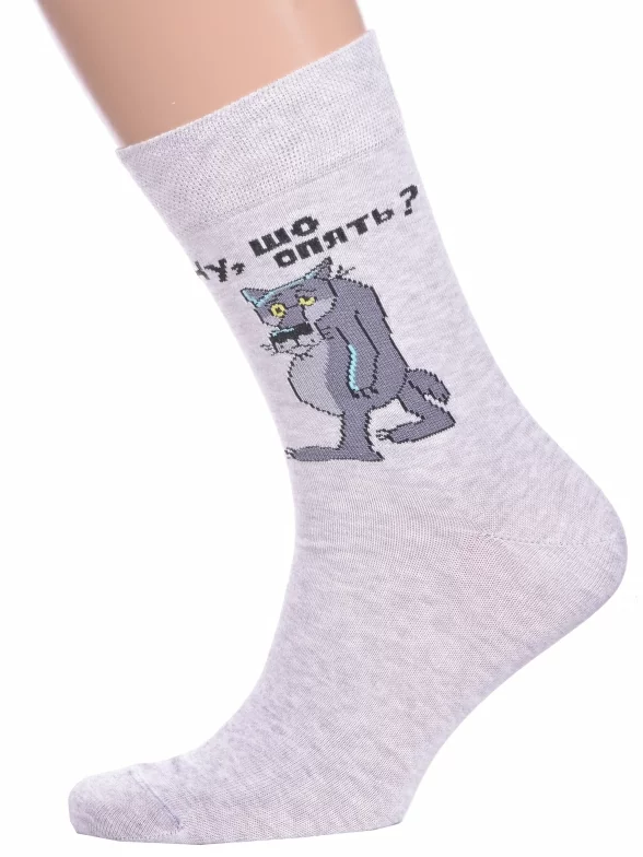 Круглогодичные средней длины мужские носки, цвет светло-серый, повседневные, возможно бесшовные, принт (рисунок): фильмы / сериалы / мультики, надписи, животные, с узором, состав: 70% хлопок, 28% полиамид, 2% эластан, арт. 23С2155. Производитель «Брестский чулочный комбинат ОАО, Беларусь» под брендом «Брестские (бчк)».