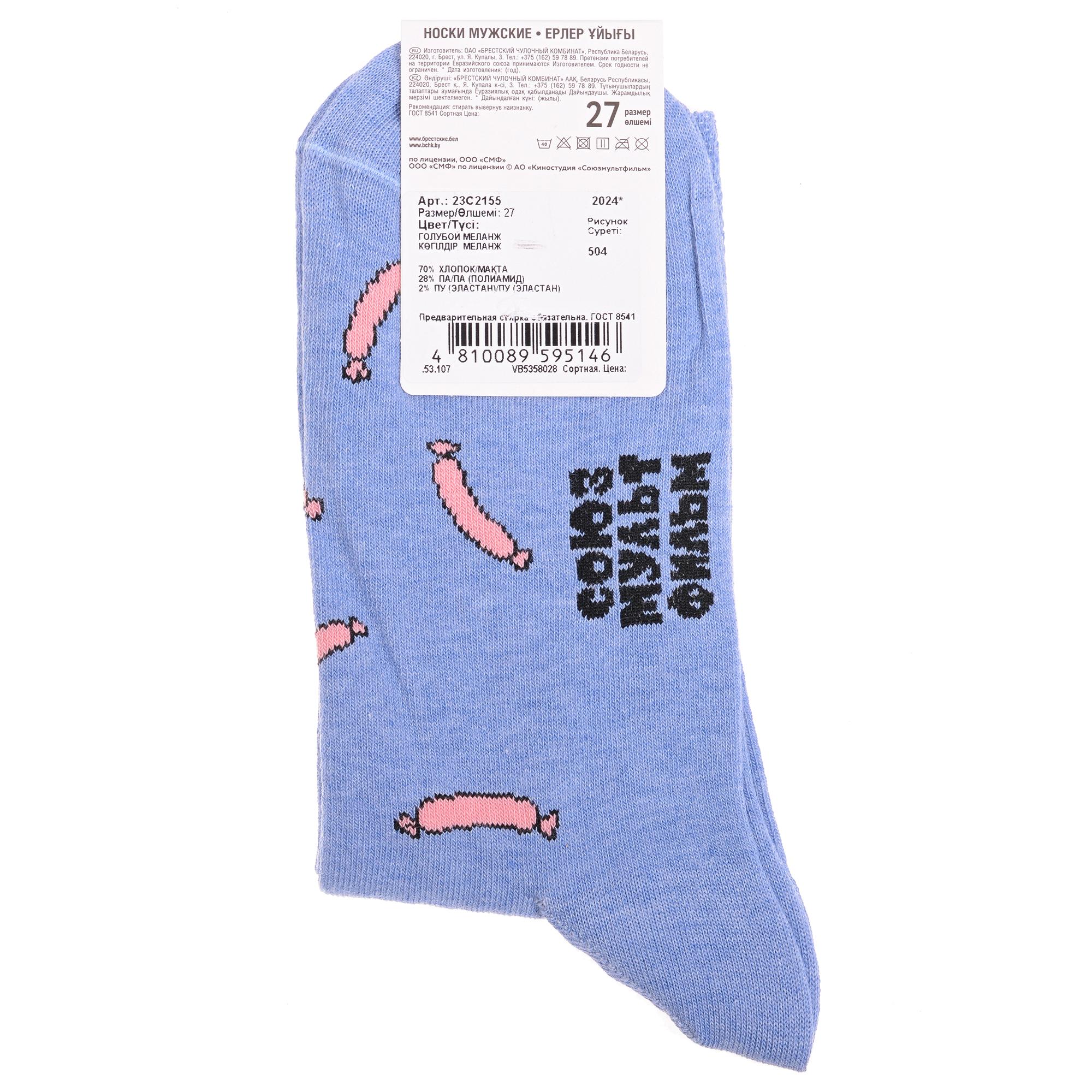 Круглогодичные средней длины мужские носки, цвет голубой, повседневные, возможно бесшовные, принт (рисунок): фильмы / сериалы / мультики, животные, с узором, состав: 70% хлопок, 28% полиамид, 2% эластан, арт. 23С2155. Производитель «Брестский чулочный комбинат ОАО, Беларусь» под брендом «Брестские (бчк)».