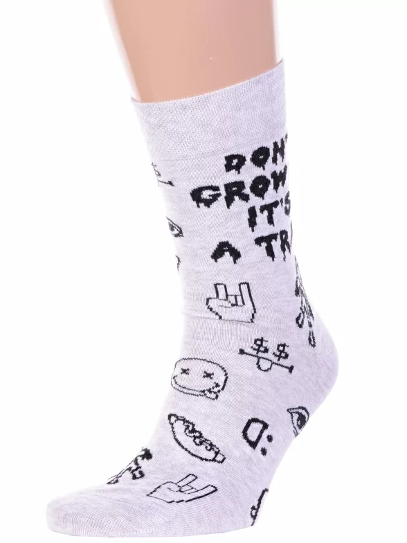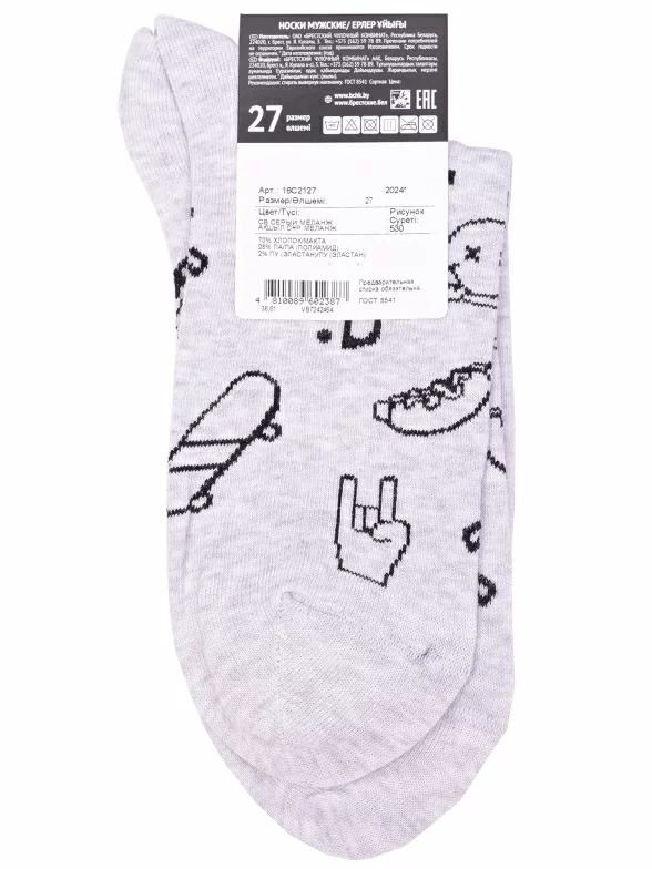 Круглогодичные укороченные мужские носки, цвет светло-серый, повседневные, возможно бесшовные, принт (рисунок): надписи, с узором, состав: 70% хлопок, 28% полиамид, 2% эластан, арт. 16С2127. Производитель «Брестский чулочный комбинат ОАО, Беларусь» под брендом «Брестские (бчк)».
