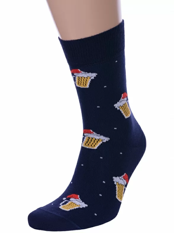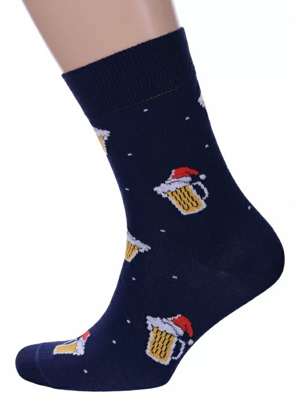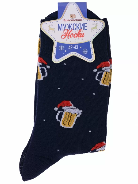 Круглогодичные средней длины мужские носки, цвет синий, шов плоский, принт (рисунок): новый год, состав: 70% хлопок, 28% полиамид, 2% эластан, арт. 20С2146. Производитель «Брестский чулочный комбинат ОАО, Беларусь» под брендом «Брестские (бчк)».