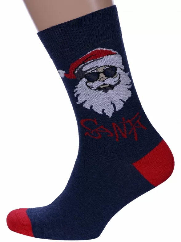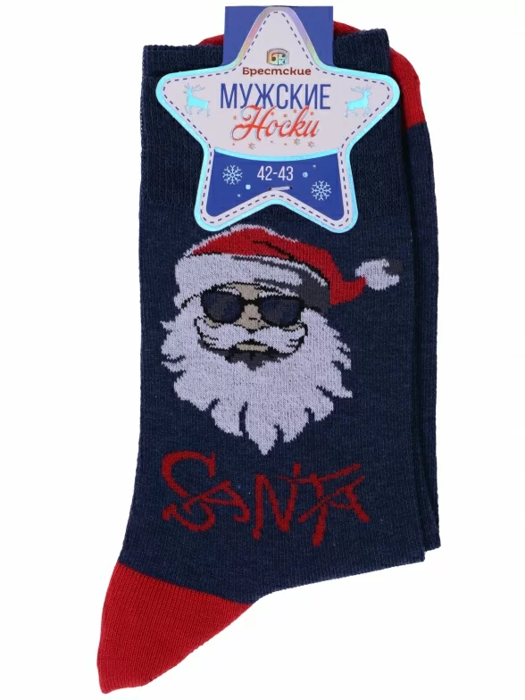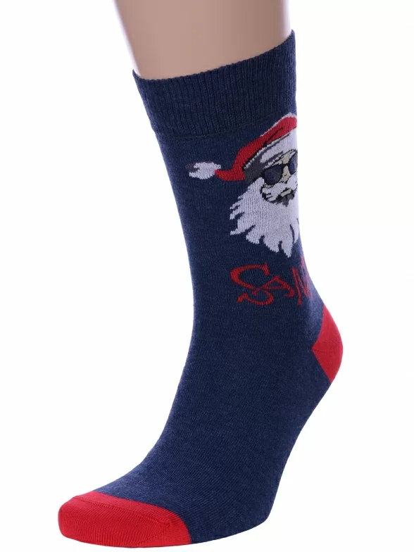 Круглогодичные средней длины мужские носки, цвет синий, шов плоский, принт (рисунок): новый год, состав: 70% хлопок, 28% полиамид, 2% эластан, арт. 20С2146. Производитель «Брестский чулочный комбинат ОАО, Беларусь» под брендом «Брестские (бчк)».