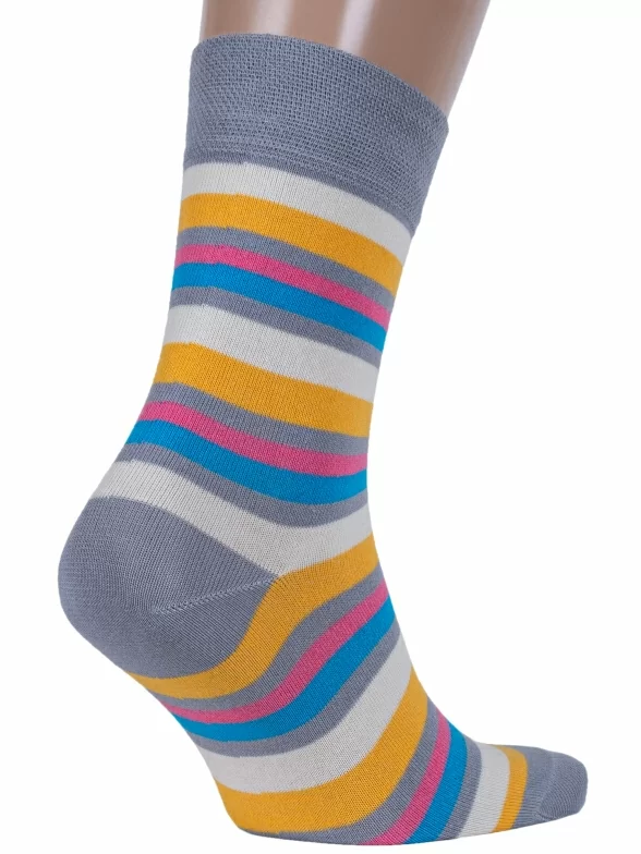 Удобные мужские носки из плотного хлопкового трикотажа. Модель классической длины оформлена полосками разной ширины. Такие носки хорошо сочетаются с модной повседневной одеждой и другими стилями.