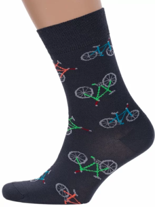 Мужские носки, сделанные из пряжи на основе хлопка, украшены принтом в виде велосипедов. Модель фиксируется широкой резинкой.