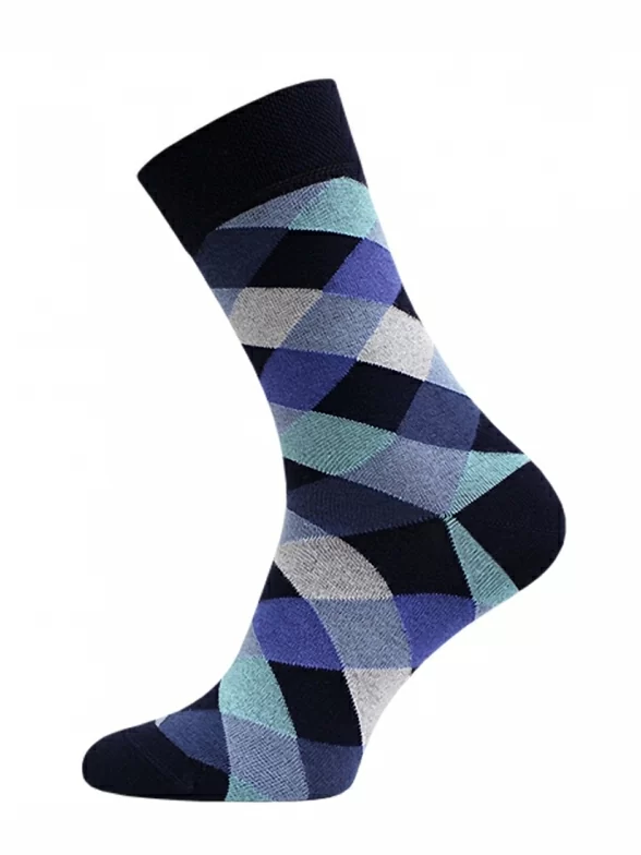 Мужские носки классической длины сделаны из хлопка с добавлением полиамида и эластана. Модель украшена разноцветными пересекающимися полосками, образующими ромбы.