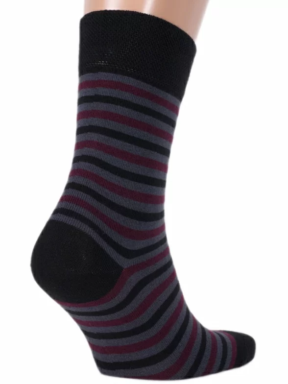 Мужские носки классической длины сделаны из хлопка с добавлением полиамида и эластана. Модель украшена разноцветными горизонтальными полосками.