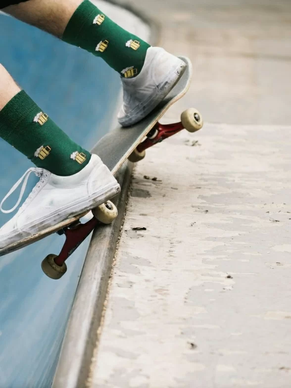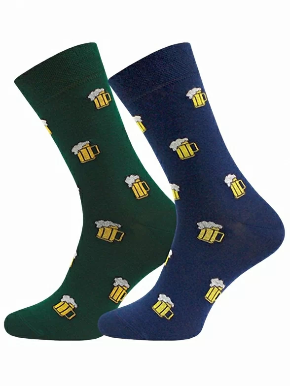 Мужские носки сделаны из мягкой пряжи на основе хлопка. Модель с широкой резинкой украшена принтом в виде пивных кружек.