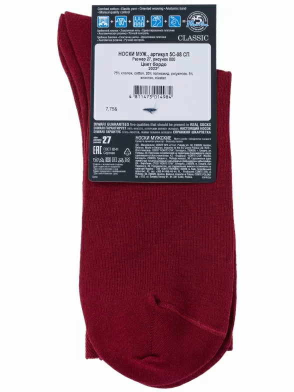 Пара бордовых носков арт. 5С-08СП поставляется с фабричной этикеткой в обычном или курьер-пакете.