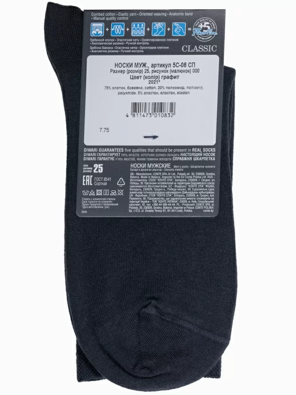 Пара носков графитового цвета артикула 5С-08СП с фабричной этикеткой поставляется в плотном транспортном пакете.