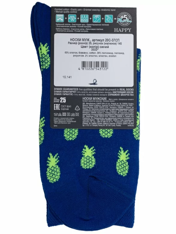 Пара синих носков артикула 20С-37СП с индивидуальной фабричной этикеткой поставляется в плотном транспортном пакете.