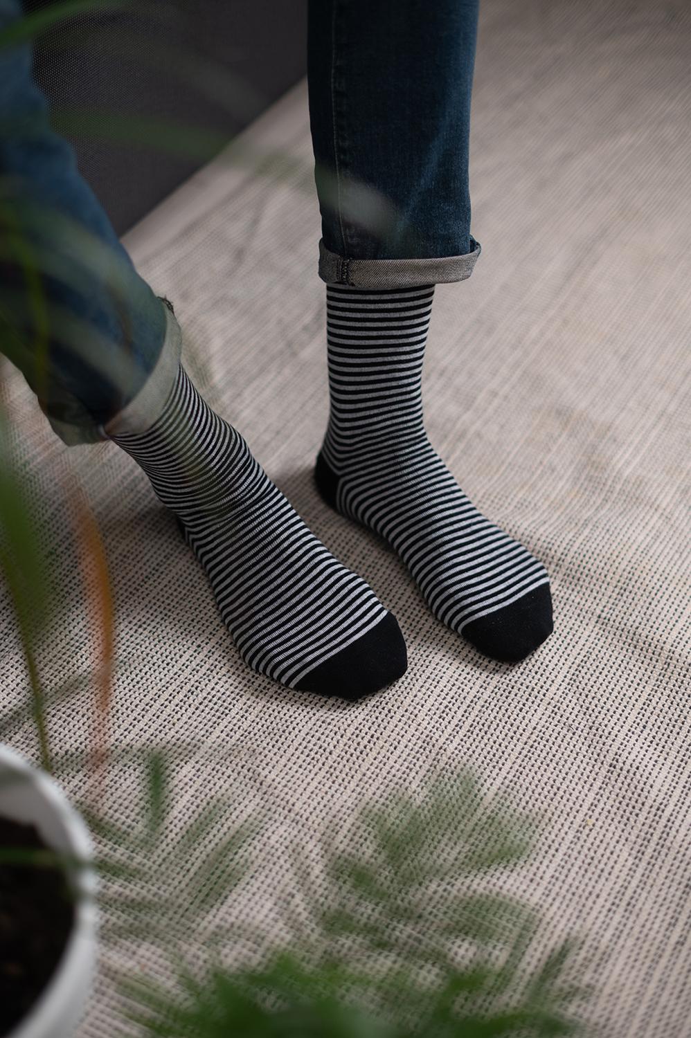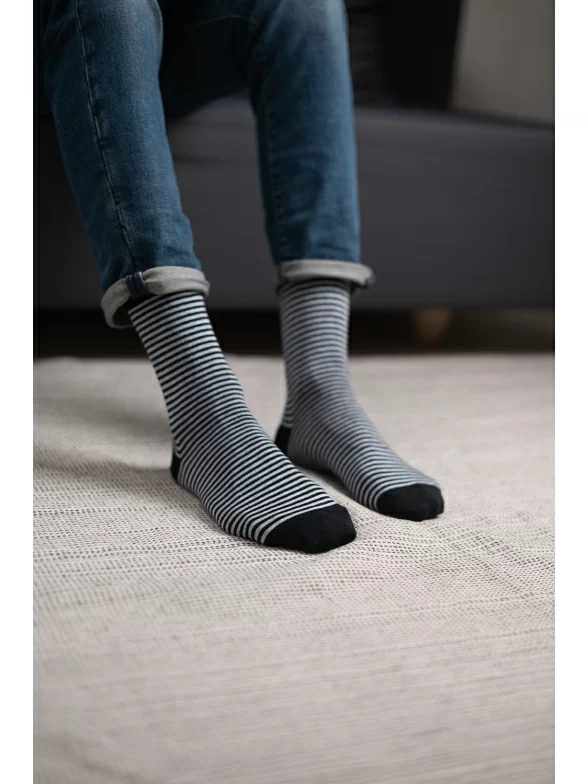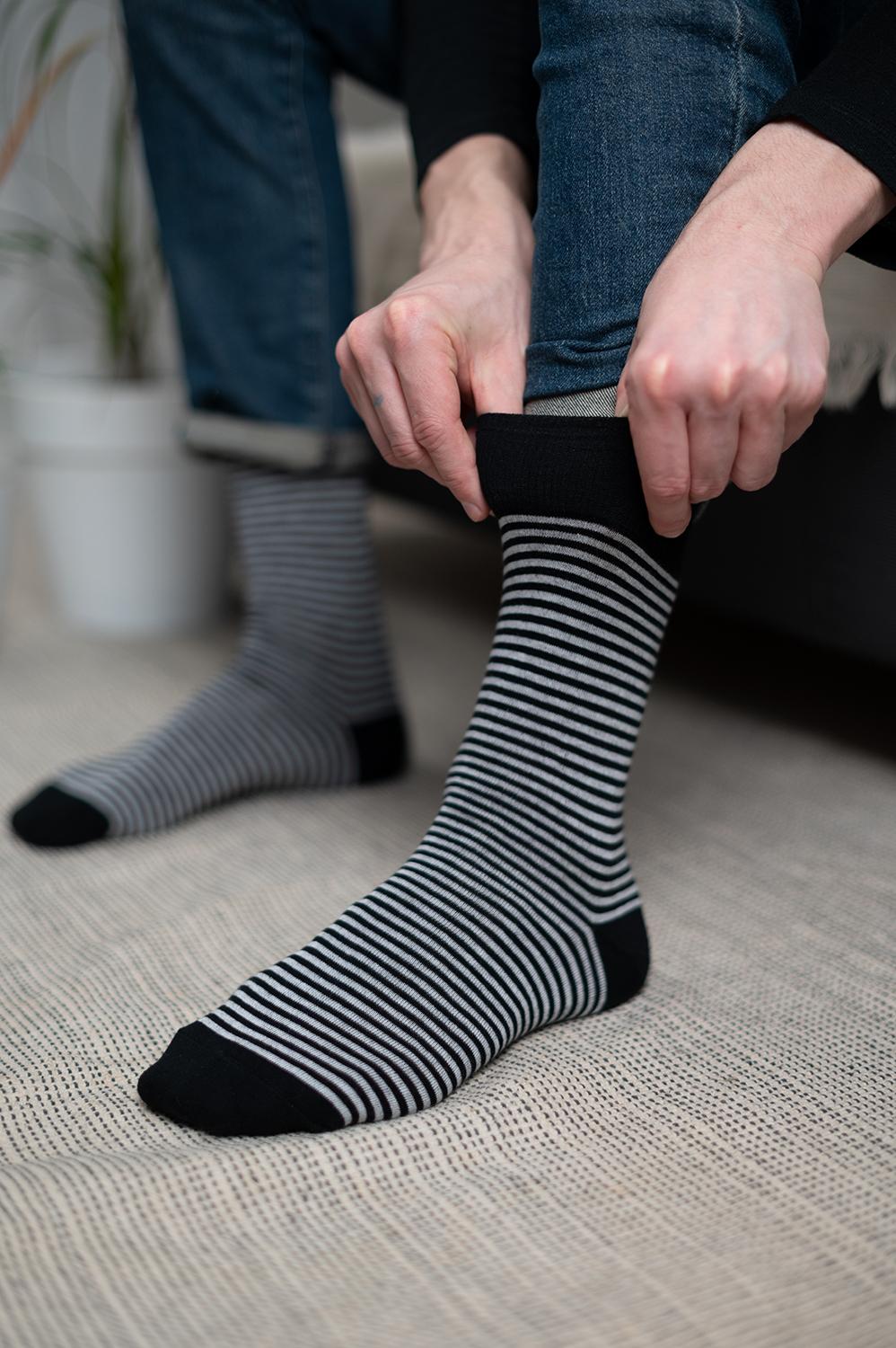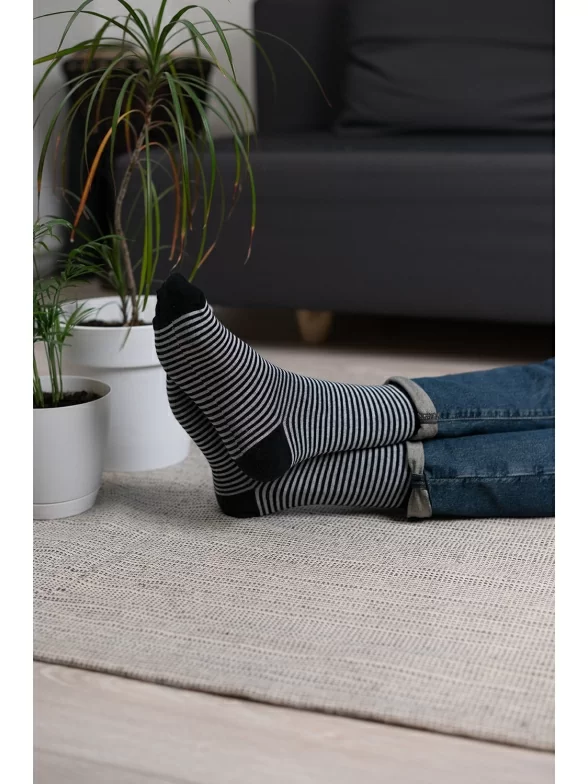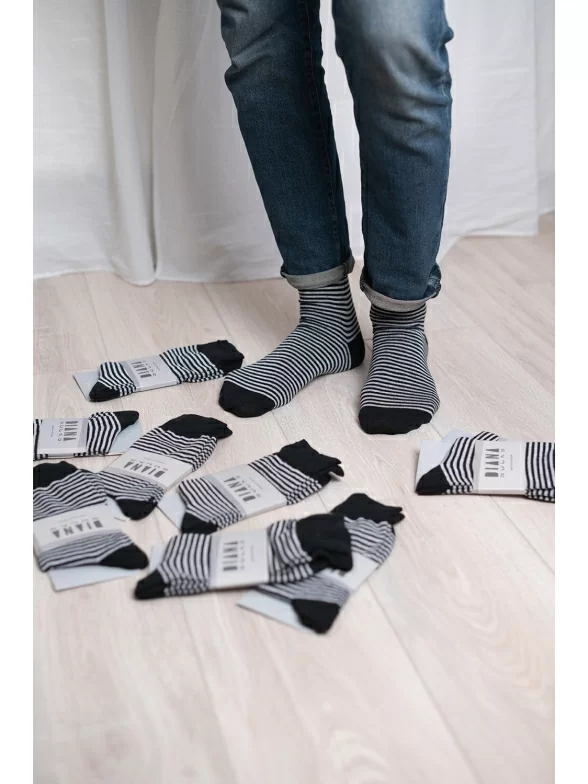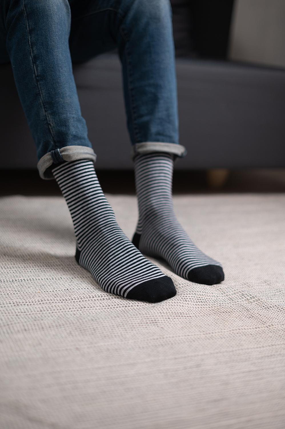 Круглогодичные средней длины мужские носки, цвет черный, классические, шов обычный (не бесшовные), принт (рисунок): полоски, с узором, состав: 80% хлопок, 17% полиамид, 3% эластан, арт. FP_006. Производитель «Flappers Peppers» Россия под брендом «Flappers peppers».