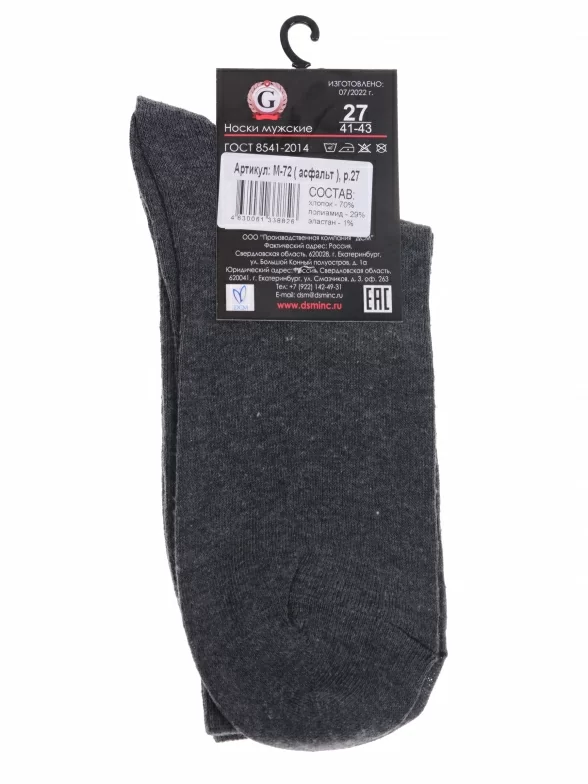 Круглогодичные средней длины мужские носки, цвет серый, классические, шов обычный (не бесшовные), принт (рисунок): без рисунков/узоров, состав: 70% хлопок, 29% полиамид, 1% эластан, арт. М-72. Производитель «ООО Производственная компания "ДСМ", Россия» под брендом «Grand line».