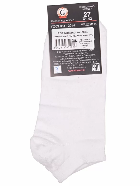 Межсезонные или летние короткие мужские носки, цвет белый, классические, шов обычный (не бесшовные), принт (рисунок): однотонный, без рисунков/узоров, состав: 80% хлопок, 17% полиамид, 3% эластан, арт. МК-29. Производитель «ООО Производственная компания "ДСМ", Россия» под брендом «Grand line».