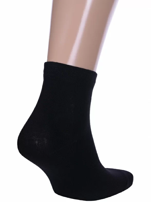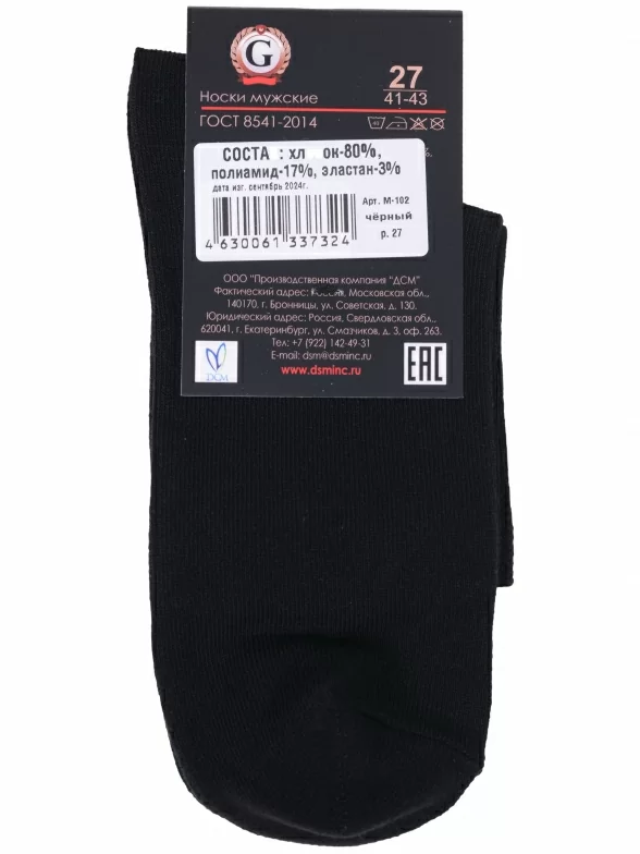 Межсезонные или летние укороченные мужские носки, цвет черный, классические, шов обычный (не бесшовные), принт (рисунок): однотонный, без рисунков / узоров, состав: 80% хлопок, 17% полиамид, 3% эластан, арт. М-102. Производитель «ООО Производственная компания "ДСМ", Россия» под брендом «Grand line».