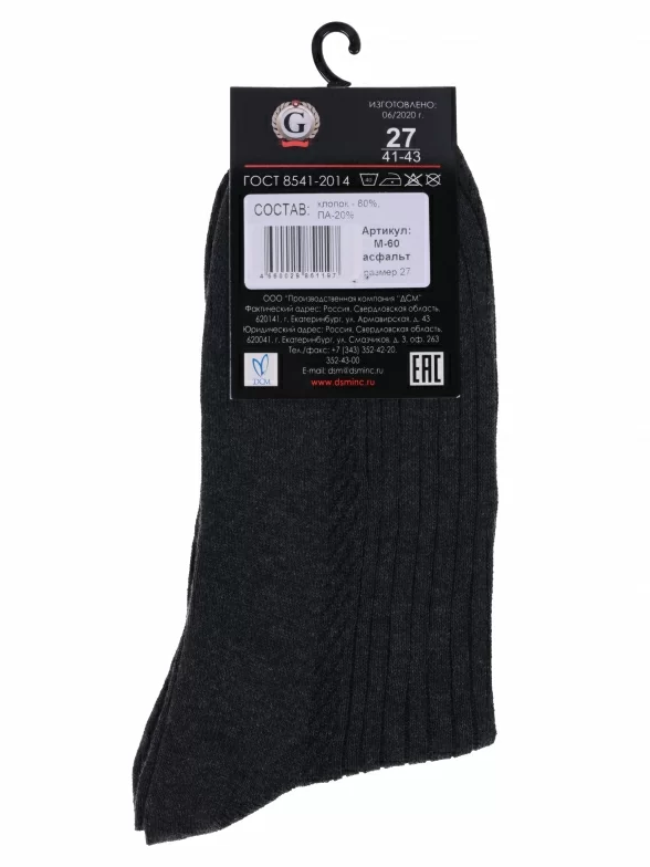 Межсезонные или летние средней длины мужские носки, цвет темно-серый, классические, шов обычный (не бесшовные), принт (рисунок): с узором, однотонный, состав: 80% хлопок, 20% полиамид, арт. М-60. Производитель «ООО Производственная компания "ДСМ", Россия» под брендом «Grand line».