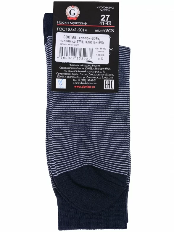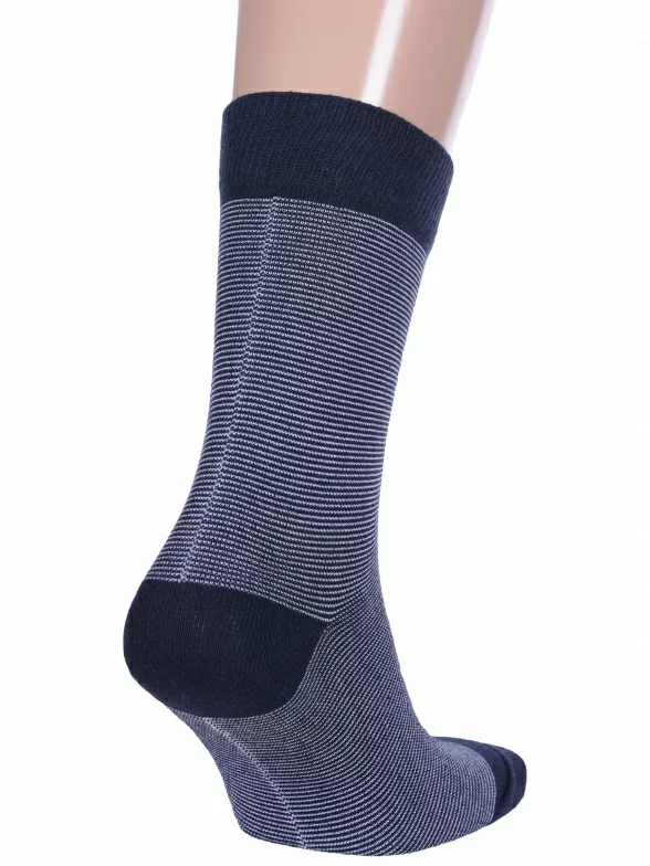 Круглогодичные средней длины мужские носки, цвет темно-синий, классические, шов обычный (не бесшовные), принт (рисунок): полоски, состав: 80% хлопок, 17% полиамид, 3% эластан, арт. М-107. Производитель «ООО Производственная компания "ДСМ", Россия» под брендом «Grand line».