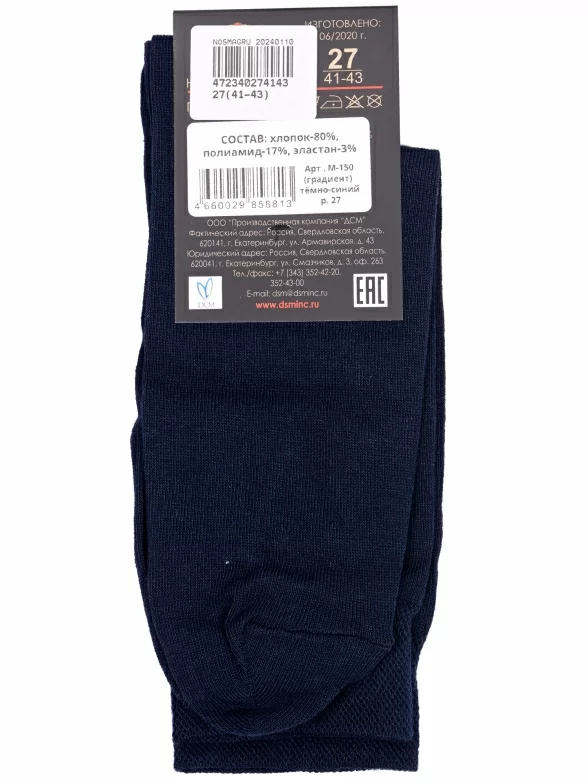 Круглогодичные средней длины мужские носки, цвет темно-синий, классические, шов обычный (не бесшовные), принт (рисунок): однотонный, без рисунков/узоров, состав: 80% хлопок, 17% полиамид, 3% эластан, арт. М-150. Производитель «ООО Производственная компания "ДСМ", Россия» под брендом «Grand line».