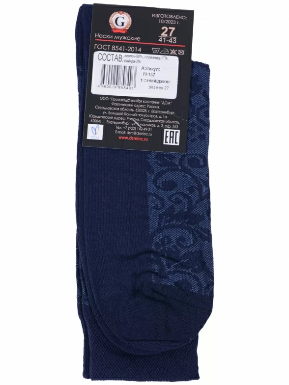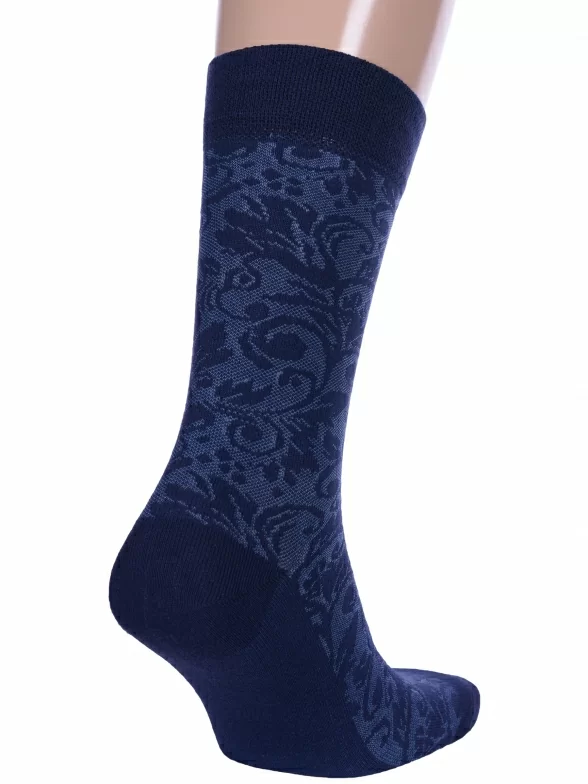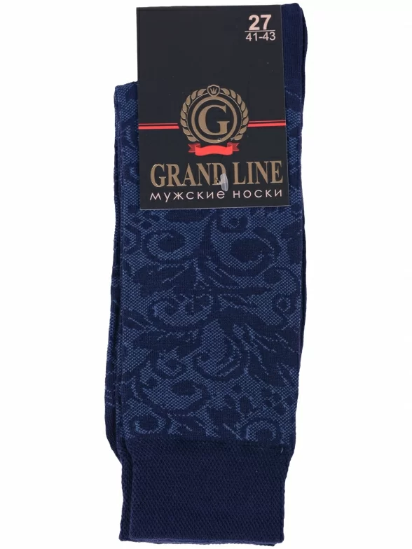 Круглогодичные средней длины мужские носки, цвет темно-синий, ажурные, шов обычный (не бесшовные), принт (рисунок): цветы / растения, с узором, состав: 80% хлопок, 17% полиамид, 3% эластан, арт. М-157. Производитель «ООО Производственная компания "ДСМ", Россия» под брендом «Grand line».