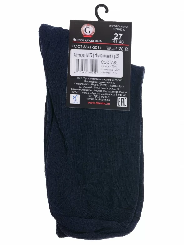 Круглогодичные средней длины мужские носки, цвет темно-синий, классические, шов обычный (не бесшовные), принт (рисунок): без рисунков/узоров, состав: 70% хлопок, 29% полиамид, 1% эластан, арт. М-72. Производитель «ООО Производственная компания "ДСМ", Россия» под брендом «Grand line».