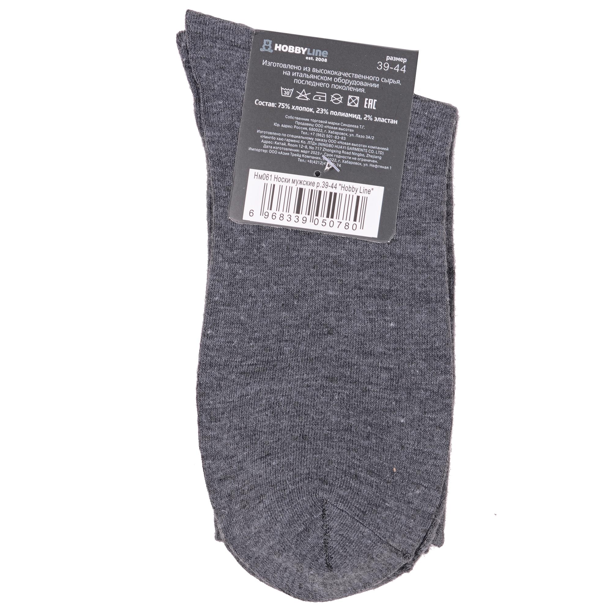 Круглогодичные средней длины мужские носки, цвет темно-серый, классические, шов обычный (не бесшовные), принт (рисунок): однотонный, без рисунков/узоров, состав: 75% хлопок, 23% полиамид, 2% эластан, арт. Нм061. Производитель «Китай, страна бренда - Россия» под брендом «Hobby line».