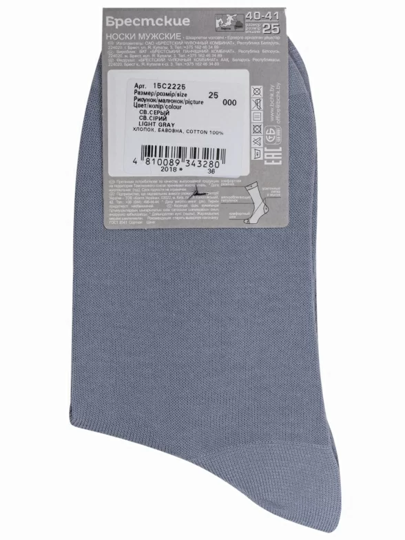 Круглогодичные или летние средней длины мужские носки, цвет светло-серый, классические, шов кеттельный (бесшовная технология), принт (рисунок): однотонный, без рисунков/узоров, состав: 100% хлопок, арт. 15С2225. Производитель «Брестский чулочный комбинат ОАО, Беларусь» под брендом «Брестские (бчк)».
