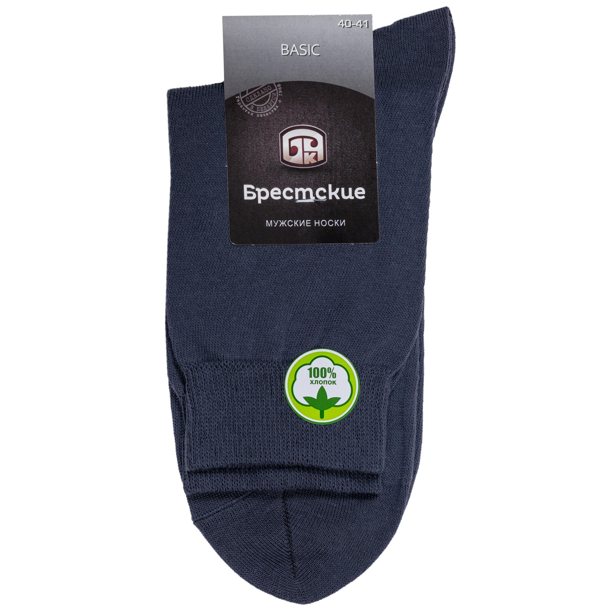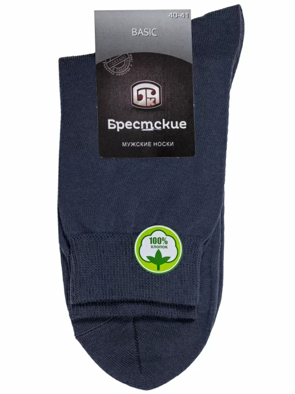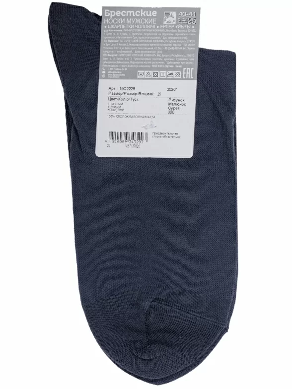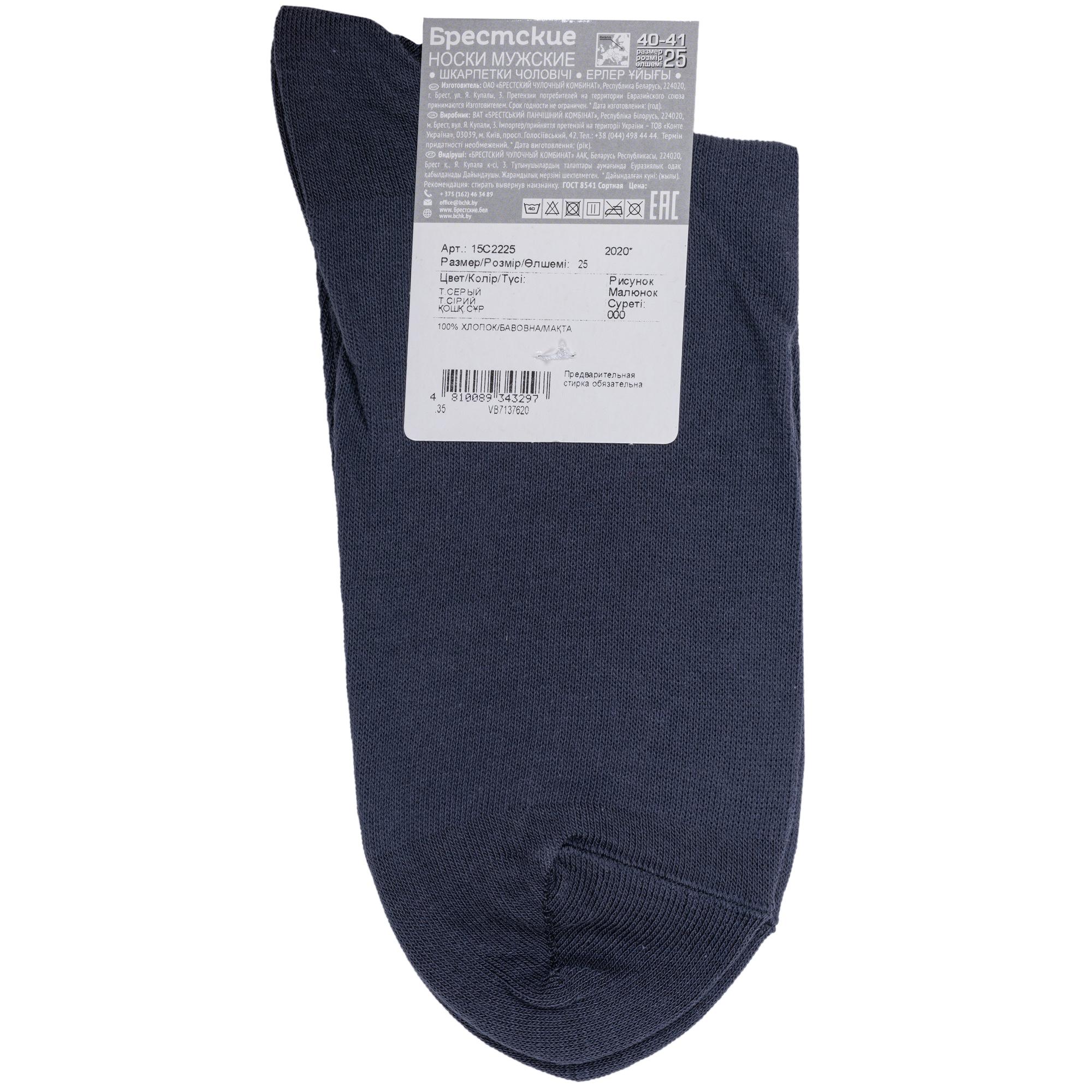 Круглогодичные или летние средней длины мужские носки, цвет темно-серый, классические, шов кеттельный (бесшовная технология), принт (рисунок): однотонный, без рисунков/узоров, состав: 100% хлопок, арт. 15С2225. Производитель «Брестский чулочный комбинат ОАО, Беларусь» под брендом «Брестские (бчк)».