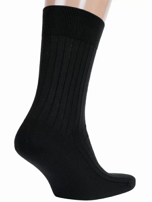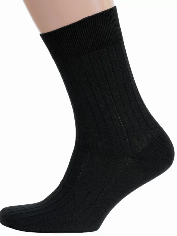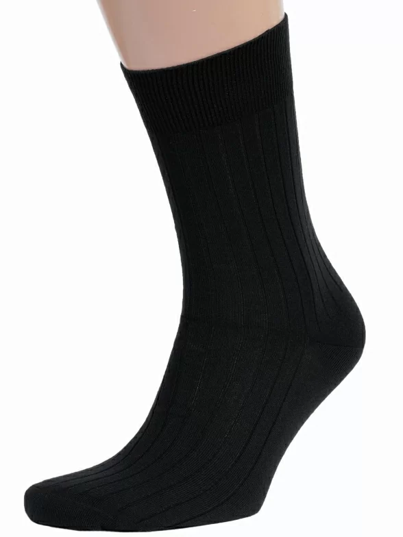 Летние или круглогодичные средней длины мужские носки, цвет черный, классические, шов кеттельный (бесшовная технология), принт (рисунок): в рубчик, однотонный, состав: 100% хлопок, арт. М3-11001. Производитель «ООО Орудьевский трикотаж, Россия» под брендом «Rusocks (орудьевский трикотаж)».