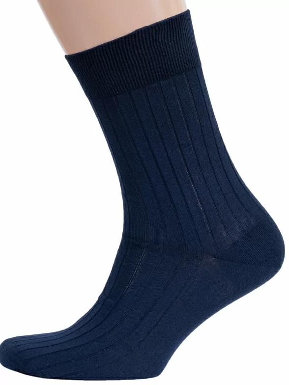 Летние или круглогодичные средней длины мужские носки, цвет темно-синий, классические, шов кеттельный (бесшовная технология), принт (рисунок): в рубчик, однотонный, состав: 100% хлопок, арт. М3-11001. Производитель «ООО Орудьевский трикотаж, Россия» под брендом «Rusocks (орудьевский трикотаж)».