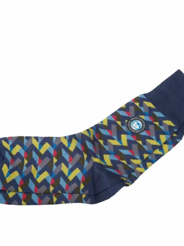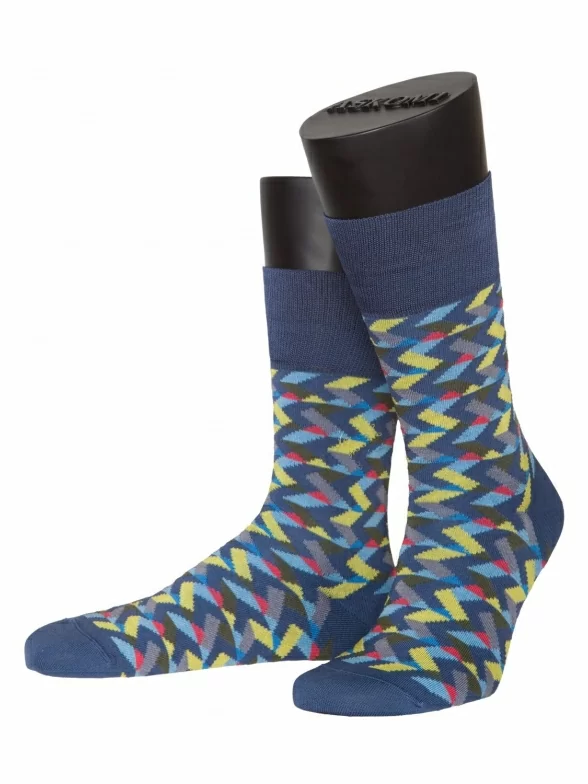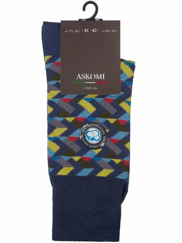 Фантазийные мужские носки классической длины, оформленные красочным геометрическим узором. Модель изготовлена из премиального трикотажа на основе мерсеризованного хлопка и отличается высокой удобной резинкой. Данный вид хлопка примечателен своей гладкой фактурой и повышенной износостойкостью.