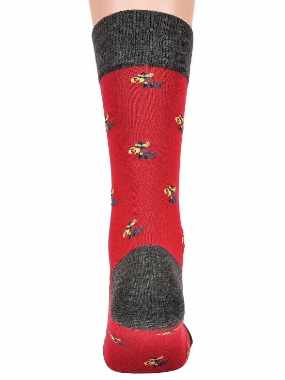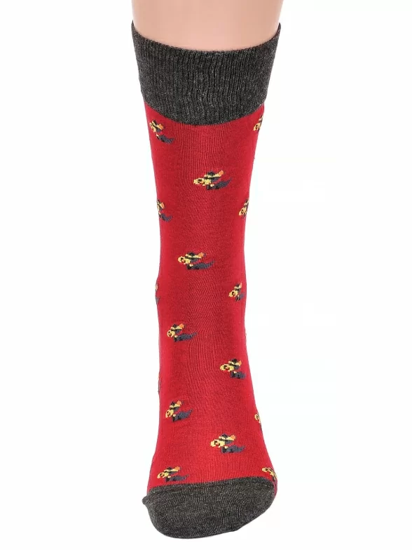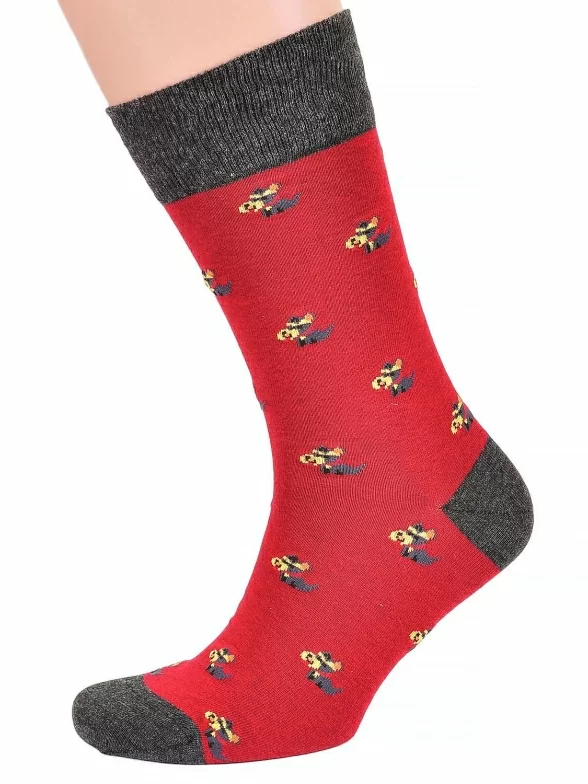 Стильные носки классической длины. Плотный трикотаж и мягкая высокая резинка делают их очень удобными. Дизайн модели отлично подходит под яркую casual одежду. Забавный принт на ярком фоне, подчеркивается однотонными элементами – пяткой, мыском и резинкой.