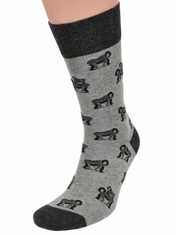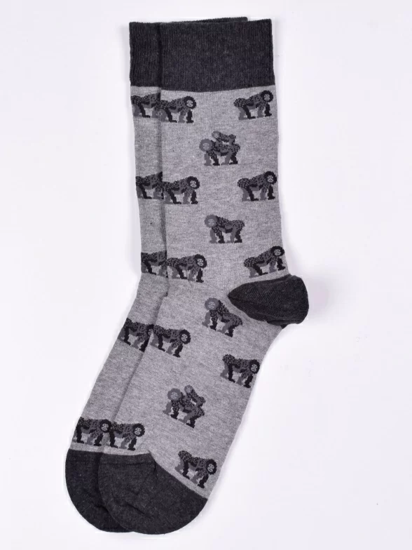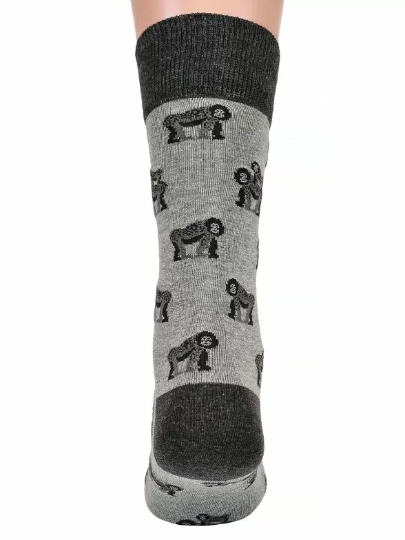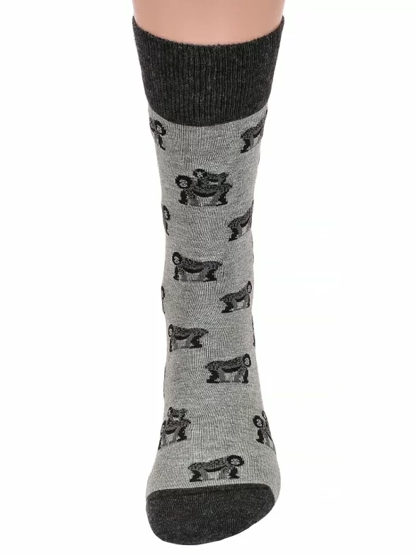 Оригинальные мужские носки, оформленные принтом с гориллами. Дизайн модели одновременно забавный и строгий, за счет цветовой гаммы, а принт дополнен контрастными однотонными элементами. Носки связаны из плотного мягкого трикотажа и отличаются высокой удобной резинкой.