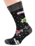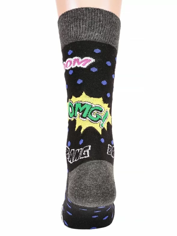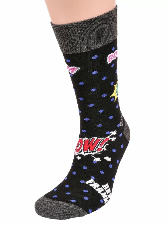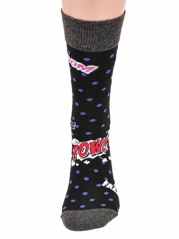 Каждый мужчина в душе мальчик, поэтому оригинальные носки классической длины, оформленные контрастным горохом и надписями в стиле, привычном по комиксам, точно понравятся. Мысок, пятка и удобная высокая резинка носков – однотонные. Модель изготовлена из плотного приятного к телу трикотажа.