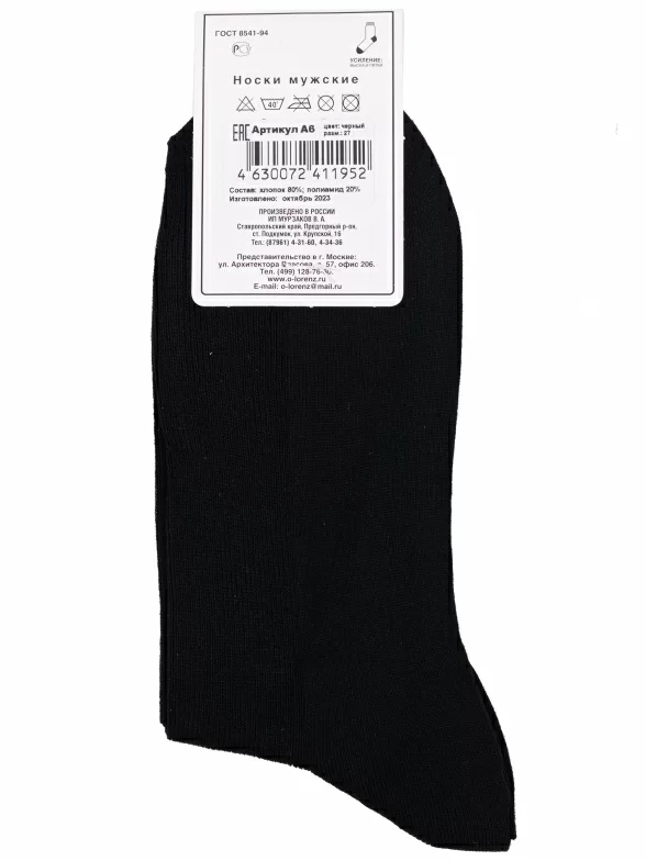 Межсезонные или летние укороченные мужские носки, цвет черный, классические, возможно бесшовные, принт (рисунок): однотонный, без рисунков/узоров, состав: 80% хлопок, 20% полиамид, арт. А6. Производитель «ИП Мурзаков В.А., Ставропольский край, Россия» под брендом «Lorenzline».