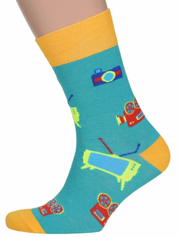 Круглогодичные средней длины мужские носки, цвет бирюзовый-многоцветные (мультиколор), повседневные, шов обычный (не бесшовные), принт (рисунок): крупные контрастные рисунки, с узором, ностальгия, техника, состав: 82% хлопок, 15% полиамид, 3% эластан, арт. ВиМ-57Э. Производитель «ИП Рыбалкин В.С., Московская область, г. Щелково» под брендом «Msclub».